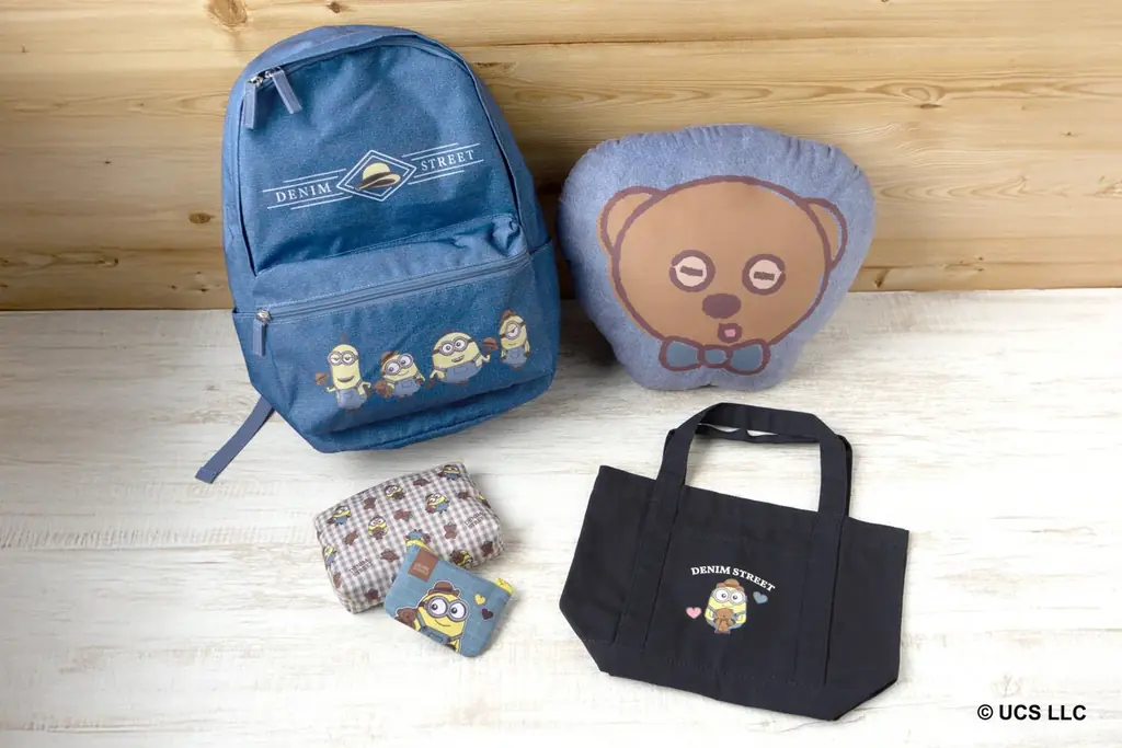デニムをテーマにしたミニオン公式グッズが中心。子供〜大人向けのアパレルやバッグ、雑貨、ぬいぐるみなど。小物は千円台中心、オーバーオールは1万〜3万円台。