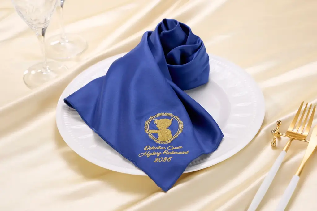 テーブルナプキンは光沢感あるブルーにコナンのシルエット刺繍が施されたデザインで、レストラン参加のチケット購入時に事前申込みが可能です。WEBチケットストアでテーブルナプキン単体の購入はできません。販売数には限りがあり、在庫状況により当日販売を行う場合があります。商品の価格・デザイン・販売店舗および販売開始日は予告なく変更となることがあります。