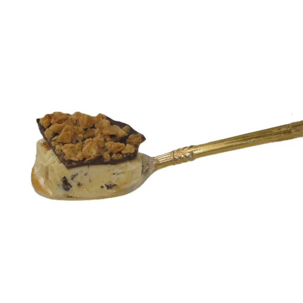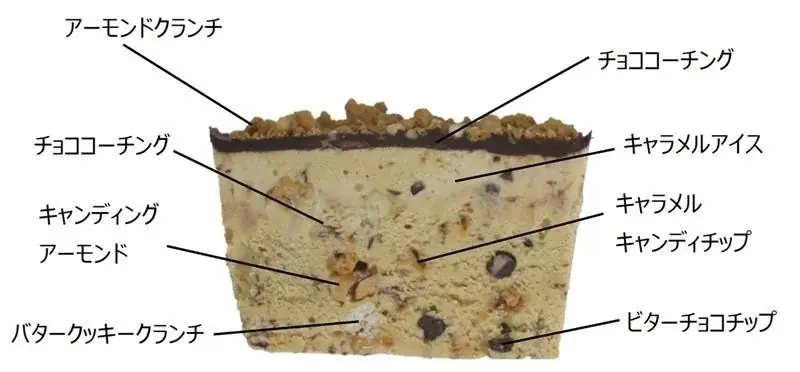 キャラメルアイスの中には「キャンディングアーモンド」「チョコチップ」「キャラメルキャンディチップ」「バタークッキークランチ」「チョココーチング」の5種類の素材を配合しています。これらが口の中で重なり合うことで、ザクザク、パリッとした多様な食感と香ばしさが生まれます。