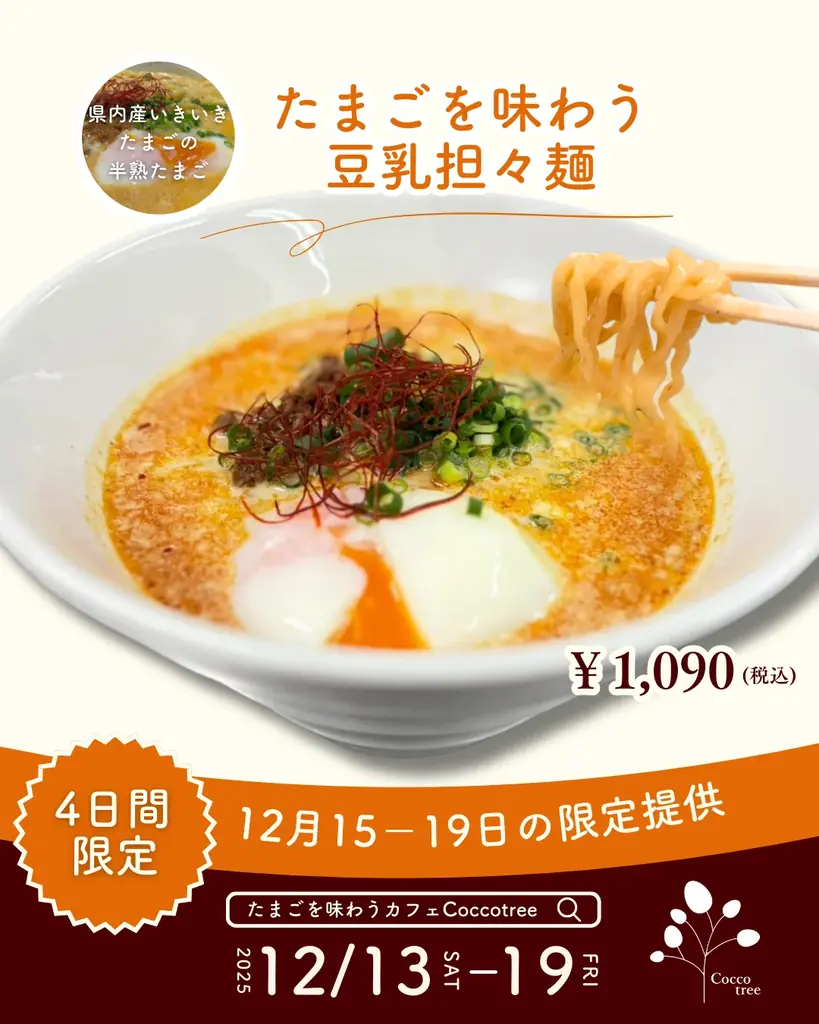 「たまごを味わう豆乳担々麺」は、12月15日(月)から19日(金)までの4日間限定で提供されますが、12月16日(火)は定休日のため実際の販売は15日、17日、18日、19日の4日間となります。価格は1,090円(税込)です。