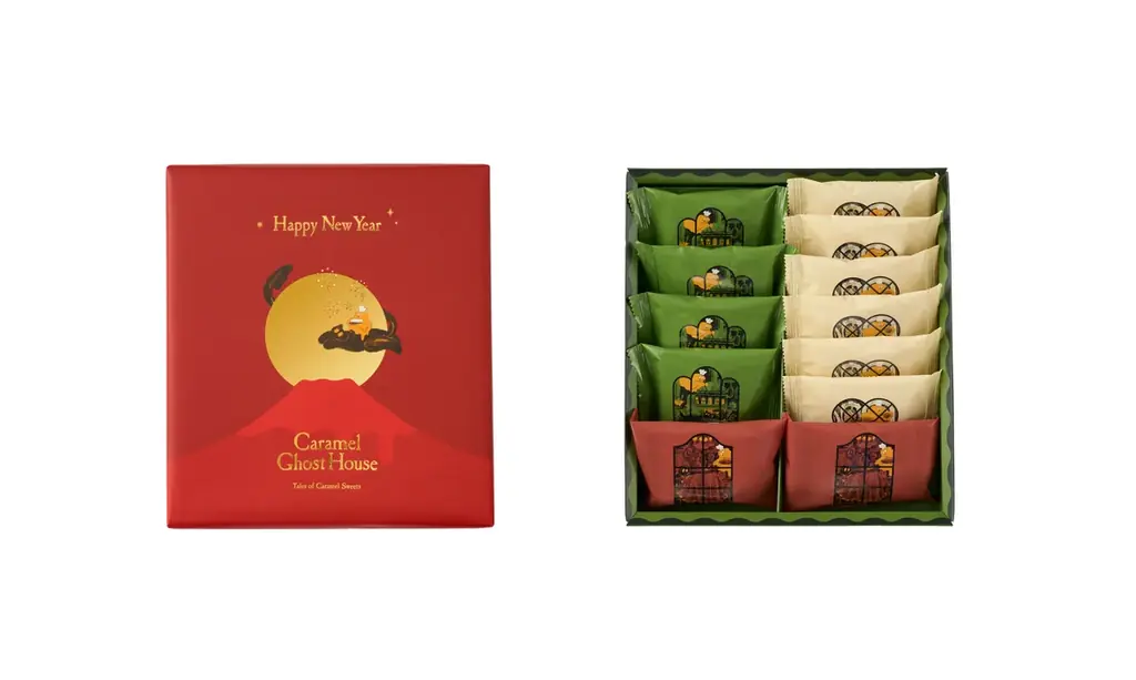 迎春パッケージは真っ赤な外装に大きな初日の出をあしらい、手に取るだけで場を明るくする意匠が採用されています。パッケージの物語性として、屋敷から飛び出したキャラメルオバケと黒猫のメルちゃんが晴れやかな空気の中を駆け巡る情景がデザインのモチーフになっています。