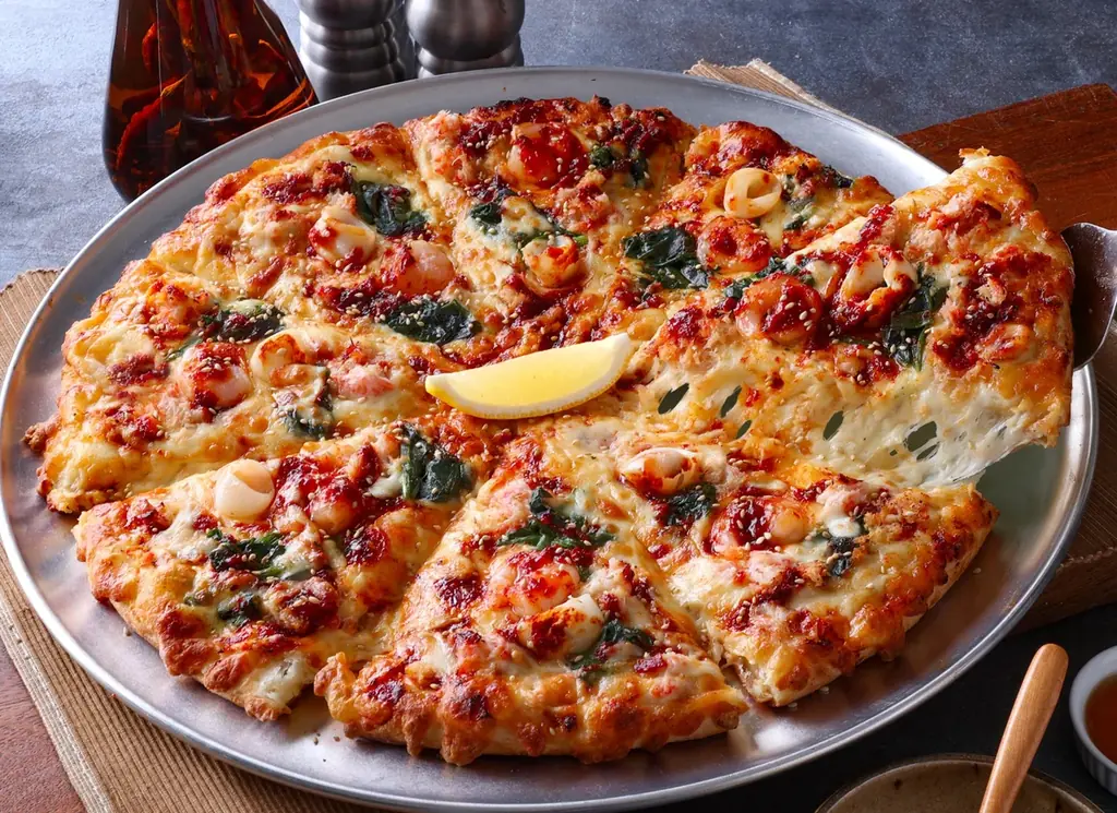 エビ・カニ・イカという“魚介ゴールデントリオ”を主体に、特製ヤンニョムソースを合わせたシーフードピザです。仕上げに生搾りのフレッシュレモンを添え、爽やかな酸味で全体の味を締めています。きまぐれクック監修のレシピに基づき、魚介の旨みを活かすバランスで仕上げられています。
