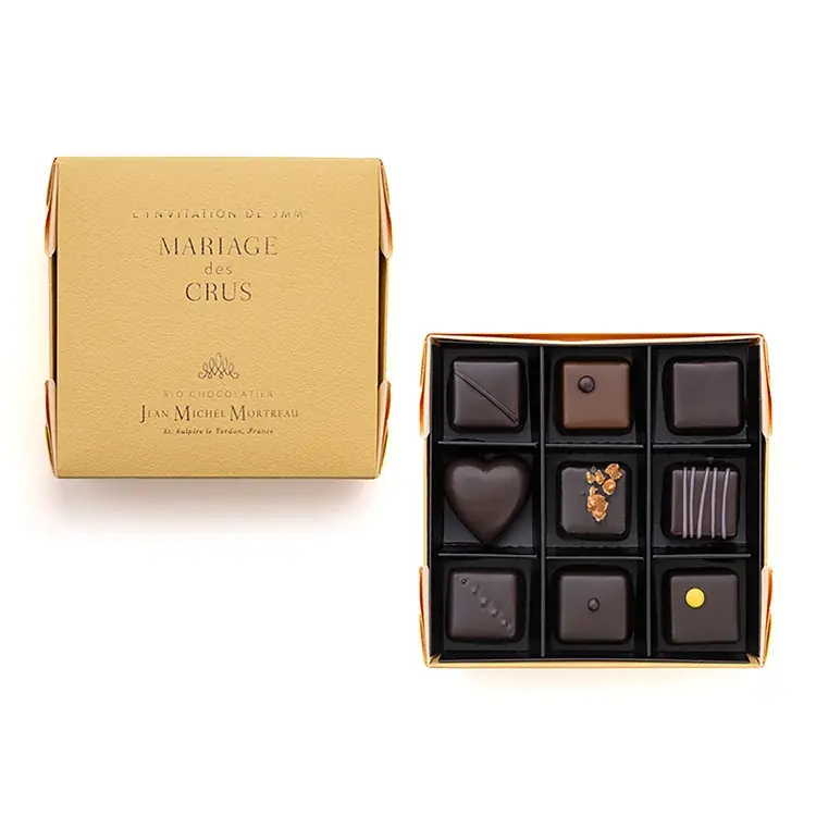 マリアージュ・デ・クル 9個入 — 3,510円。オーガニック農家をバックグラウンドに持つジャン=ミッシェル・モルトロー氏が、4カ国のカカオ産地の個性と素材のマリアージュを楽しめるアソート。