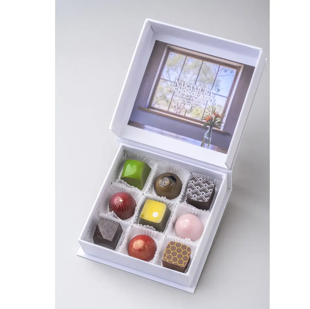 セレブレーションBOX CB9(9個入) — 5,238円。オーストラリア在住のショコラティエ中村有希氏による、宝石のような美しさとフレーバーの掛け合わせを追求した9粒の特別セット。
