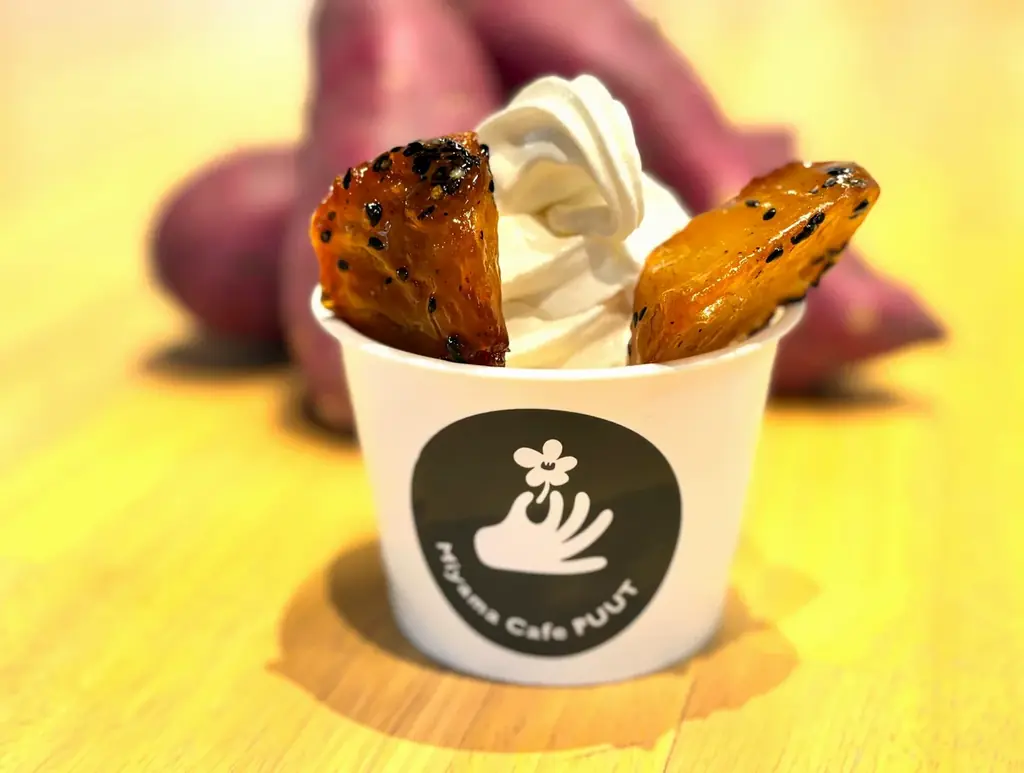 - 定番のソフトクリーム(通常価格400円/税込)に秋冬らしいトッピングとして大学芋(250円分)を贅沢にのせた商品。冷たいソフトクリームと温かい大学芋の温度差・食感の対比を楽しめます。