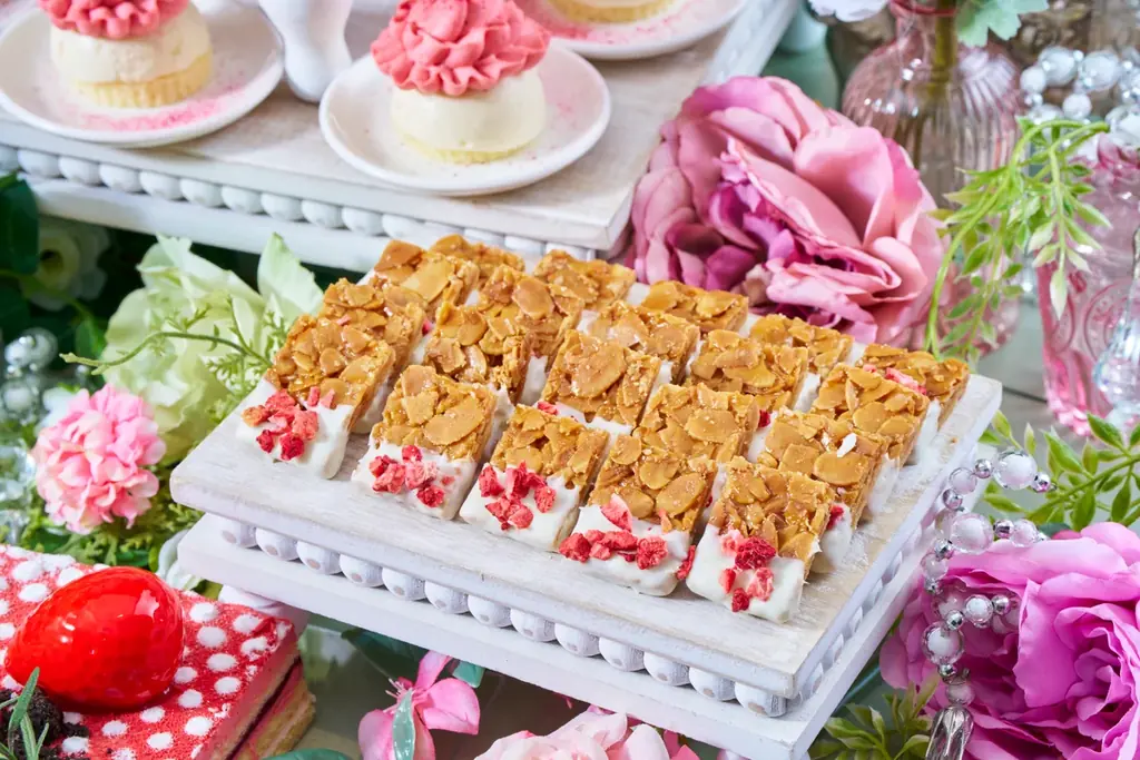 • キャラメルアーモンドの香り: キャラメリゼしたアーモンドスライスを用いたフロランタン。サクサクの食感と内側のしっとり層、いちごの余韻が一体となる一品。