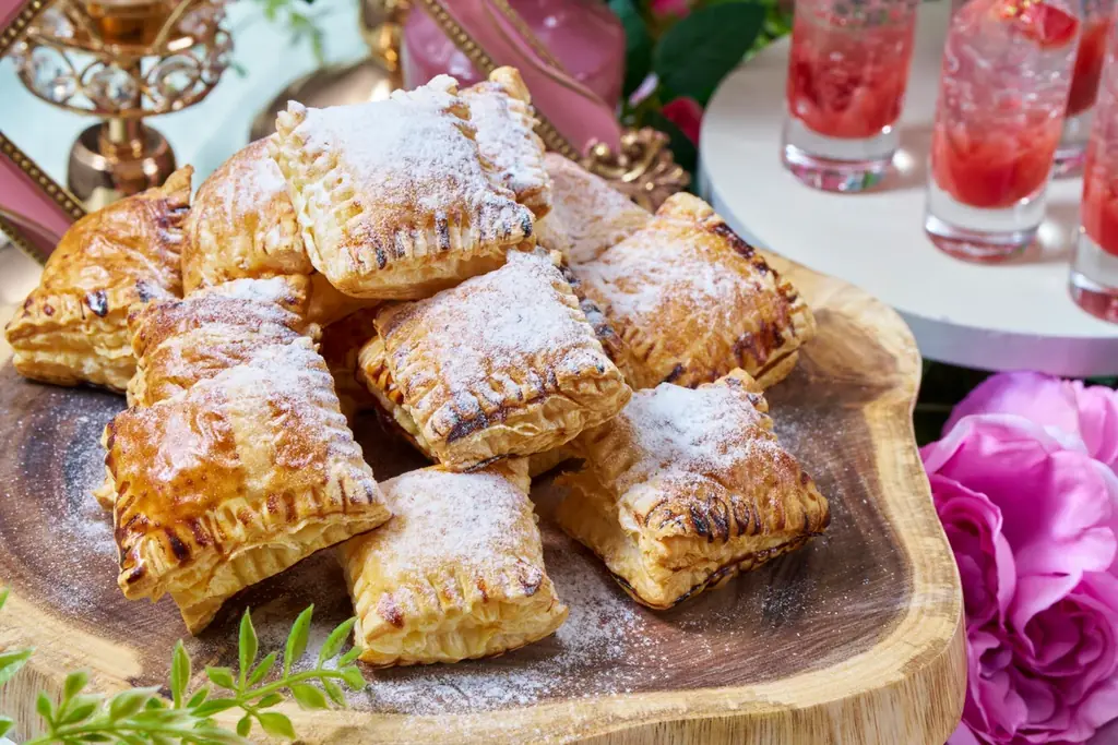 • 心はずむフィユタージュの魔法: 香ばしく焼き上げたフィユタージュに、なめらかなカスタードクリームを絞ったパイ。仕上げにシュガーパウダーを振りかけ、軽やかな甘みを加える。