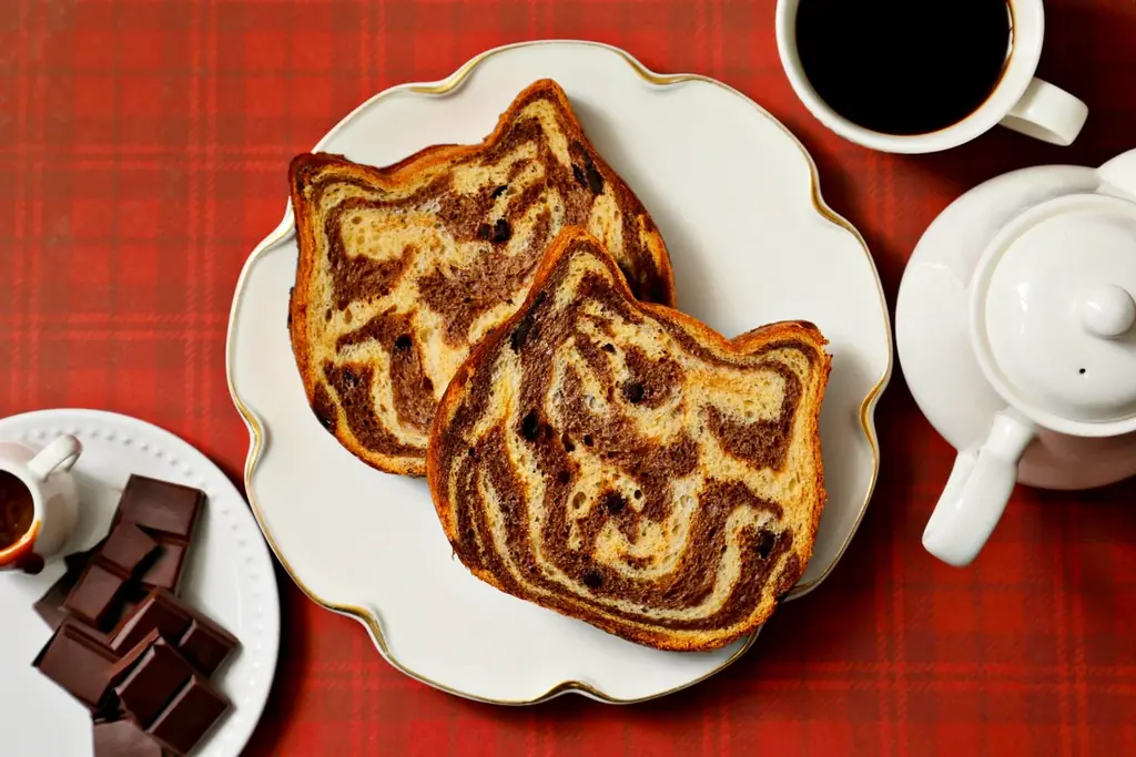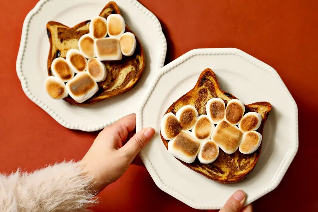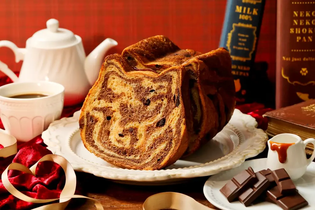 「ねこねこ食パン」からは期間限定フレーバー『ねこねこ食パン ショコラキャラメル』が登場する。チョコを練り込んだチョコチップ入り生地とキャラメルパウダーを練り込んだ生地を重ねてゼブラ模様に焼き上げたのが特徴だ。ミルク100%で仕上げた生地に、とろっと甘いキャラメルソースとやさしいチョコの風味が溶け合い、スイーツのような味わいを目指している。