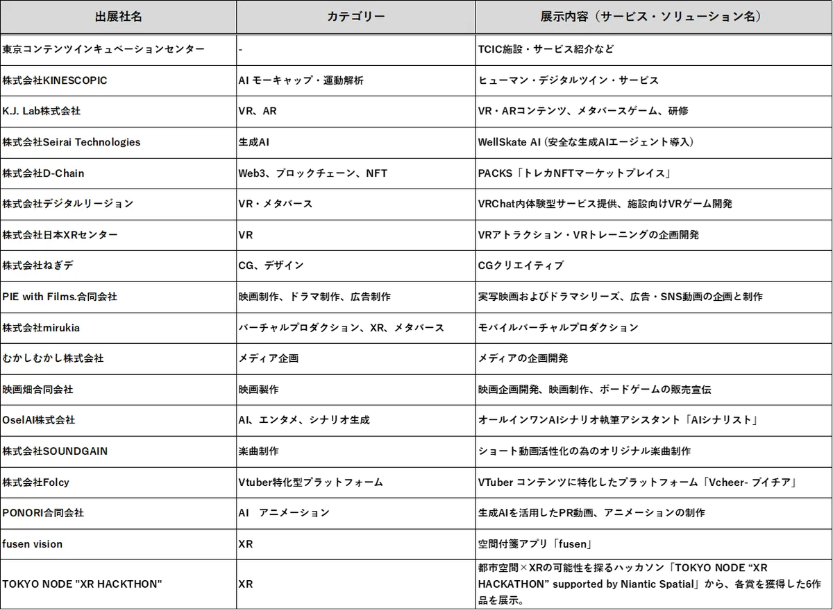 TCICパビリオンに出展する企業は以下の通りです。コンテンツ・クリエイティブ分野に特化したスタートアップや支援先が参加します。