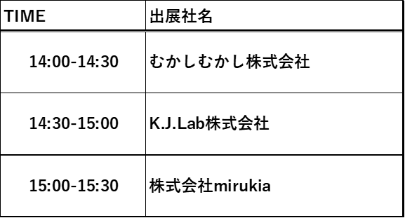 パビリオン内には特設のミニステージを設け、TCIC入居企業および支援先企業によるプレゼンテーションやデモンストレーションを行います。タイムテーブルはイベント期間中に順次運用されますが、一部変更や追加の可能性があります。