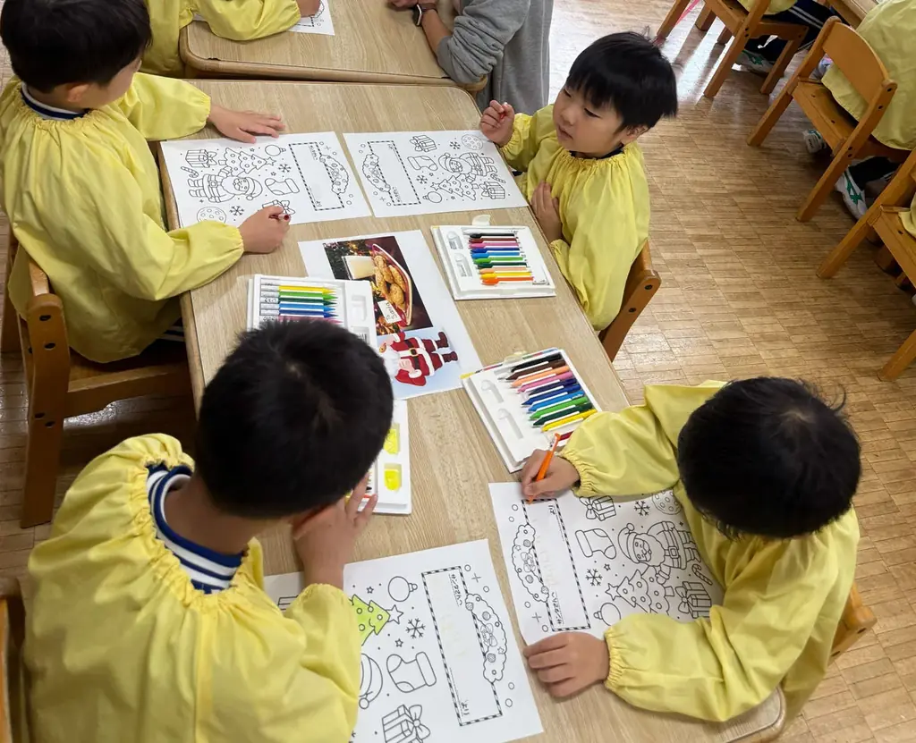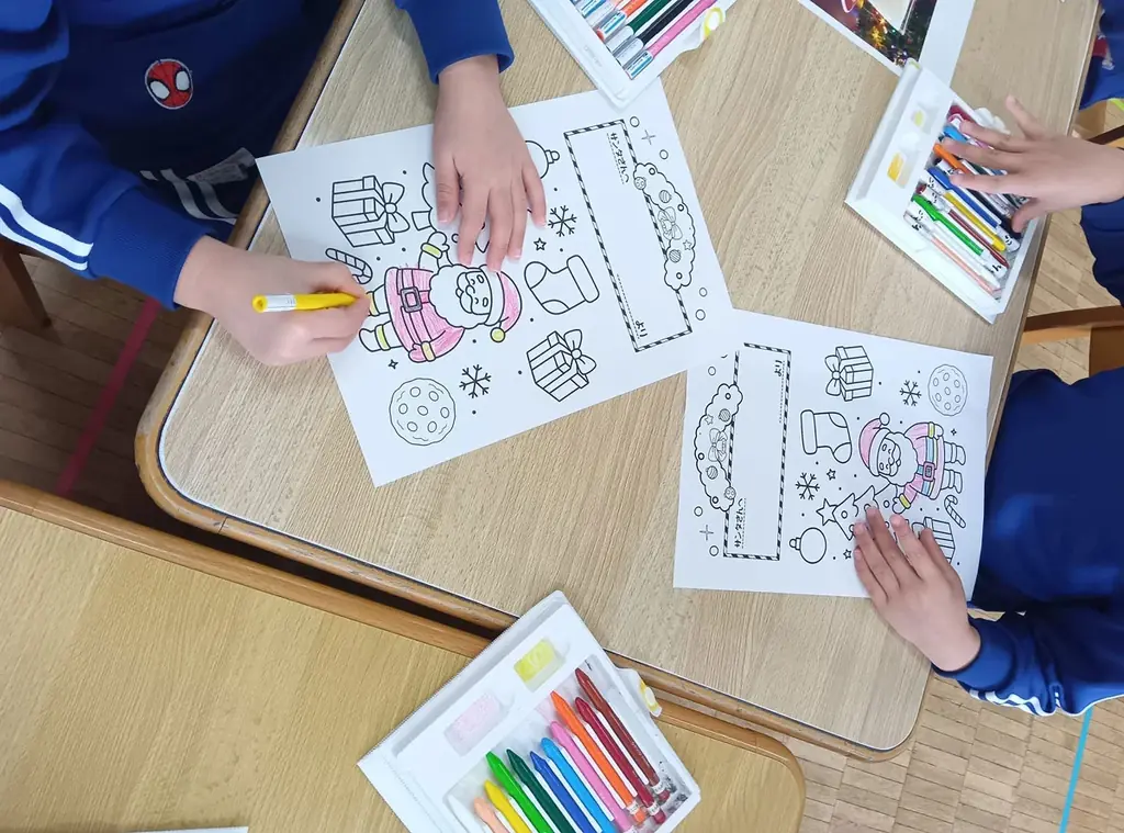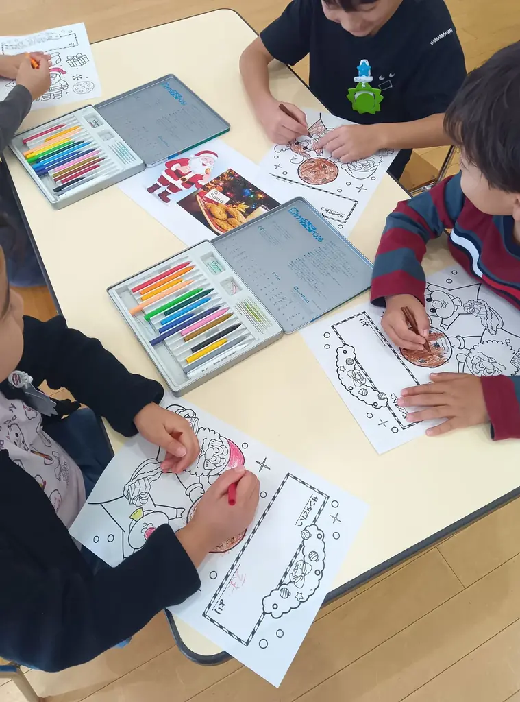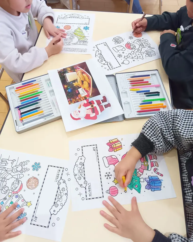 歌唱と工作を通じて、園児たちはクッキーに触れながらクリスマスの文化を学び、サンタに向けたメッセージカードを制作しました。制作では塗り絵とメッセージ記入が組み合わされ、個々の子どもが思い思いの表現をする機会が設けられました。