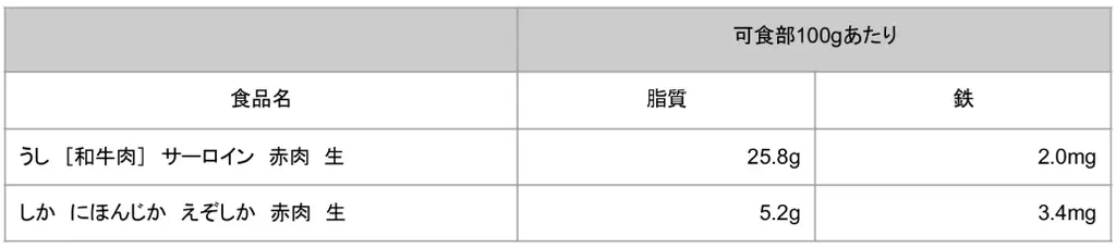 | 比較項目 | 鹿肉(にほんじか/えぞしか、赤肉、生) | 牛肉(和牛サーロイン、赤肉、生) |