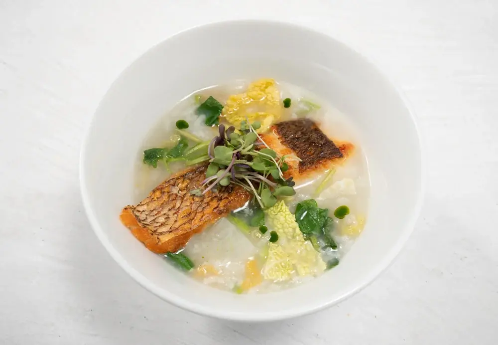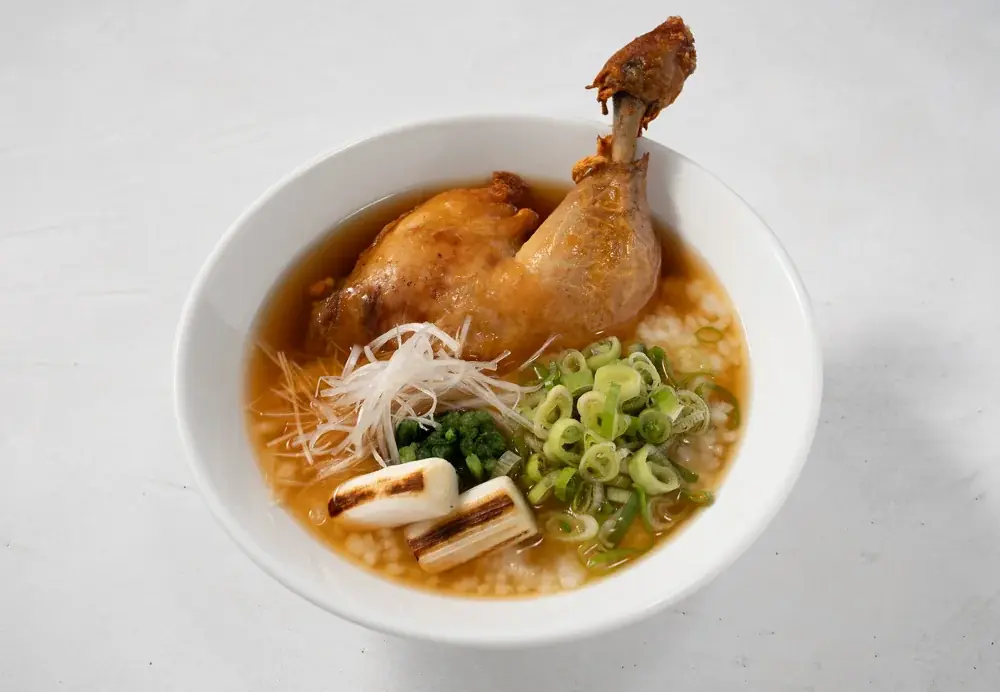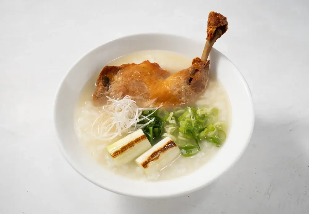 鶏のおかゆには最新調理機器iVario Proを使用し、鶏と野菜を10時間以上かけて丁寧に抽出した濃厚な鶏出汁をベースにしています。鶏のコンフィはスプーンでほぐれるほど柔らかく仕上げ、最後にオーブンで外側を香ばしく焼き上げて、パリッとした外皮とジューシーな内側の両方を実現しています。