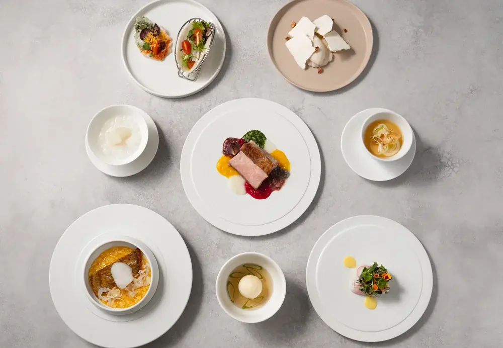 コースの一例としては、おかゆ玉をかつおだしと合わせた香ばしいお椀、6色のおかゆソースで楽しむ焼き上げた肉料理、ディナー限定のおかゆ寿司など、シェフの技と季節の食材を組み合わせた構成が紹介されています。コース終盤には日本茶専門店から厳選した季節のお茶が提供される点も記載されています。
