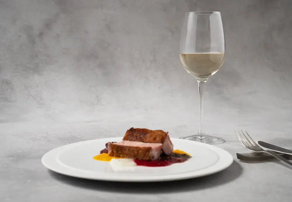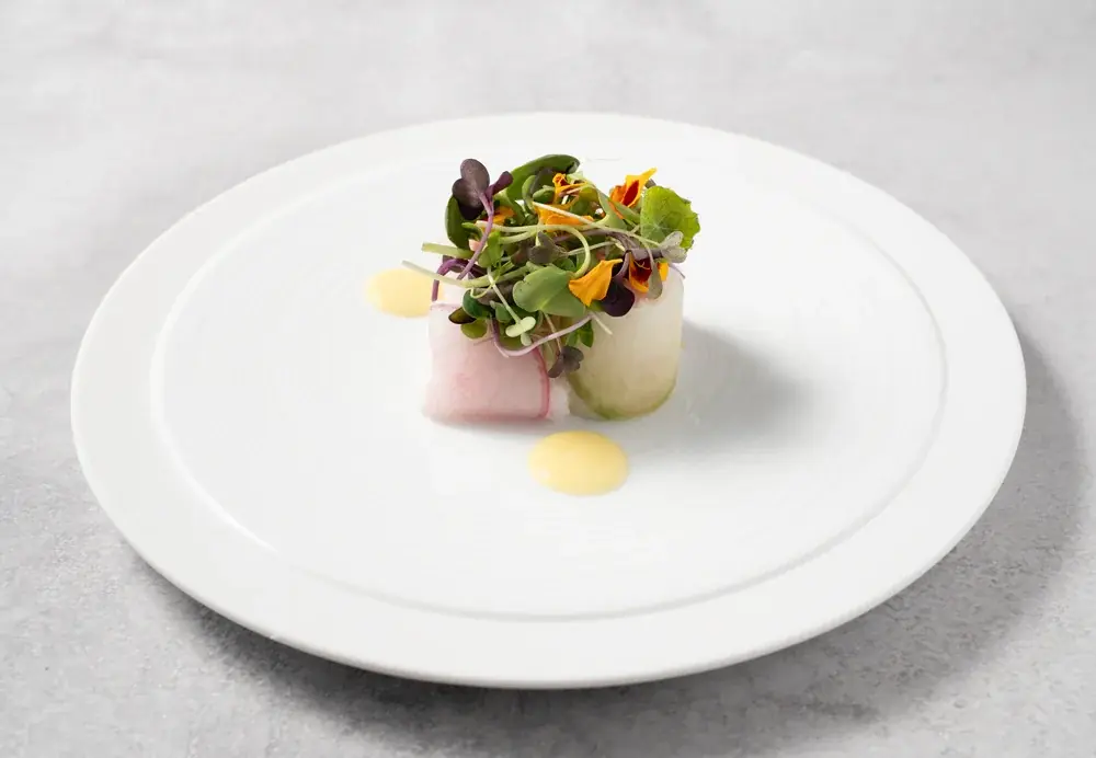 - 薄切りにした大根で旬の鮮魚とおかゆを包んだ一品。柑橘を用いたソースで風味を付け、見た目の美しさと旬の魚の旨味を同時に打ち出します。