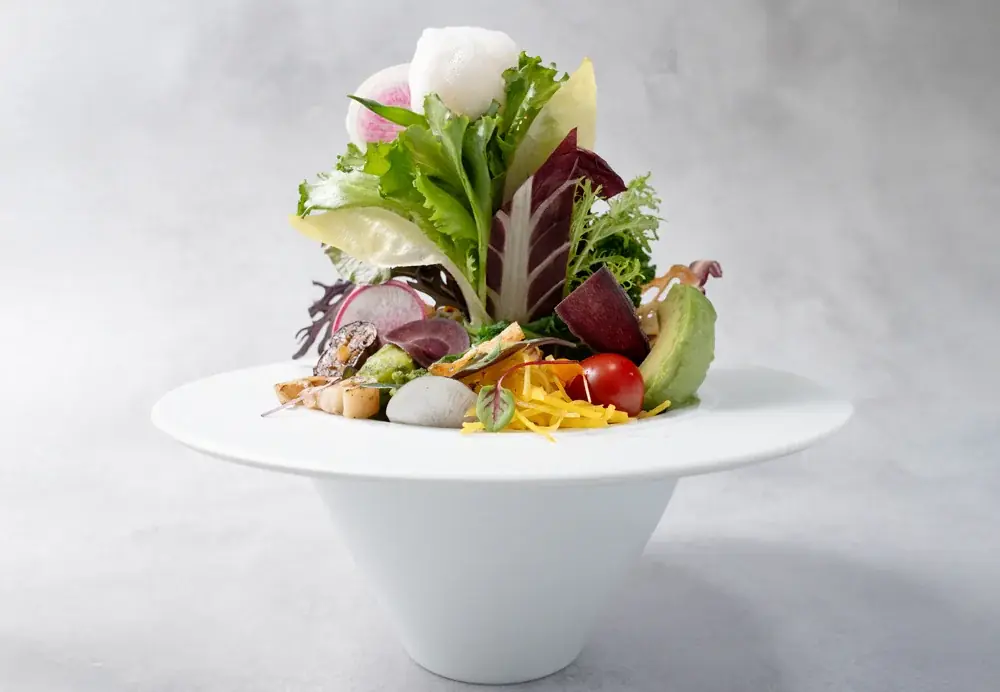 ランチは限定の「野菜の森」が看板メニューの一つです。花束のように華やかに盛り付けられた多種の野菜と、皿の下に仕込まれた特製おかゆを合わせて味わう構成で、調理法を分けることで野菜それぞれの持ち味を際立たせます。ランチではまた、骨付き鶏のコンフィを豪快に載せた3種の鶏のおかゆも用意されます。