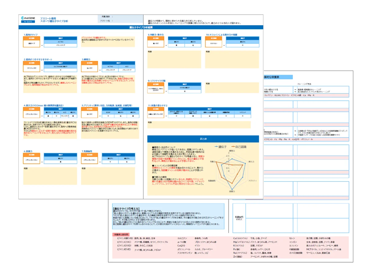 特に遺伝子タイプ分析では、30以上の遺伝子解析結果と本人の自己認識を照らし合わせ、強化すべきポイントや最適なトレーニング方針、栄養管理の提案を行うと説明されています。