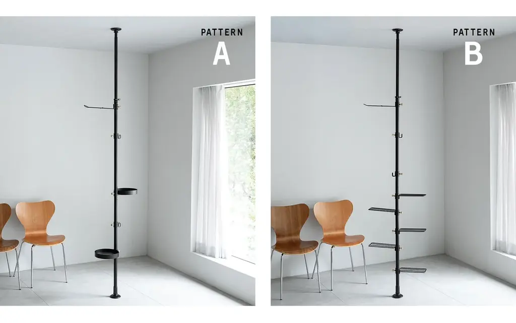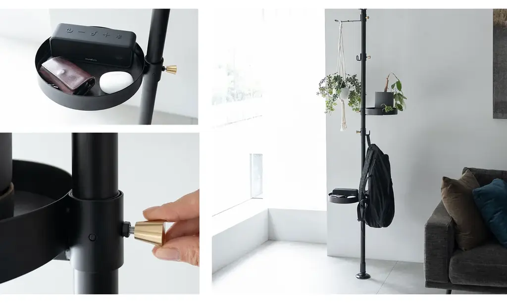ノワールは天井と床で突っ張る方式のポールハンガー兼収納ラックで、マットブラックのスチールフレームと控えめなゴールドの固定ネジをアクセントにした外観が特徴です。工具不要で設置でき、壁に穴を開けられない賃貸物件でも導入しやすい点を前面に打ち出しています。