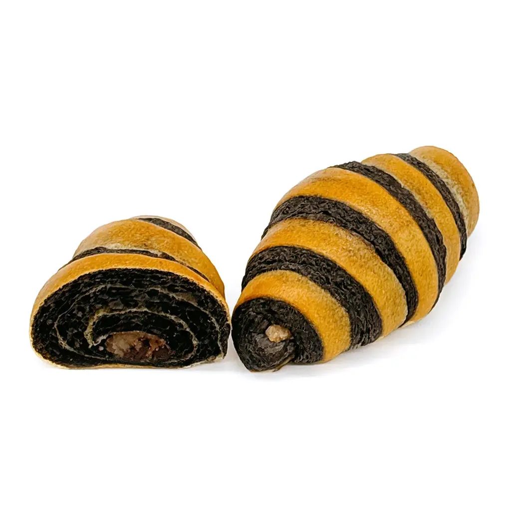 本商品は、見た目のアクセントとなる黒と黄色のクロワッサン生地で、チョコチップ入りのバナナあんを包み込んでいます。生地の色合いは視覚的なアクセントを狙ったもので、食べた際の香ばしさと餡の滑らかさがバランス良く組み合わされています。