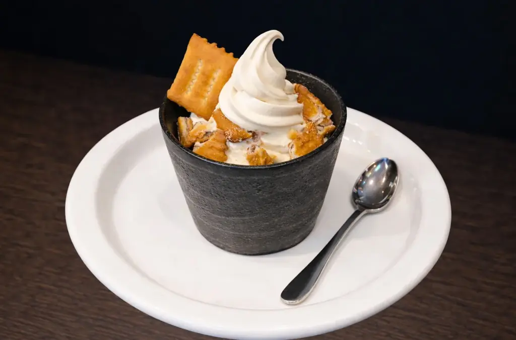 館内食事処「楽然」では、濃厚なソフトクリームに「しるこサンド」をトッピングした限定メニューを期間中毎日販売します。販売価格は450円(税込)です。