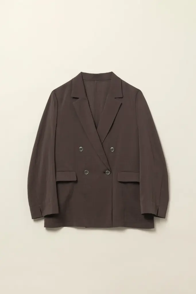 程よい光沢感と透け感のあるシアー生地を用いたダブルジャケット。羽織ると軽やかさが際立つ仕様で、暑い時期にも快適に過ごせる設計です。