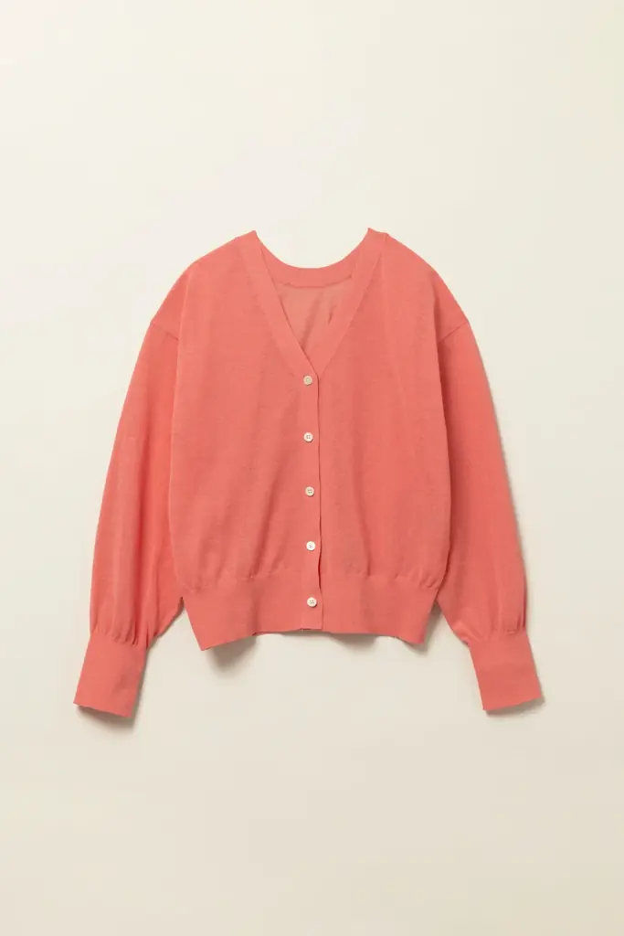程よいシアー感と張り感のある素材を使用したカーディガン。首まわりをきれいに見せるVネックが女性らしい上品な印象を引き立てます。