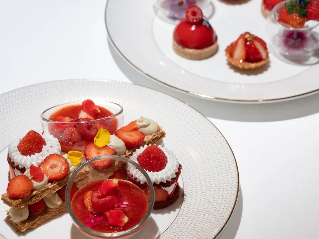 - スイーツプレート(6種): 苺のヴェルヴェットケーキ/苺のミルフィーユ/苺のタルト/苺のブランマンジェ/苺のレアチーズケーキ/フレッシュフルーツの盛り合わせ