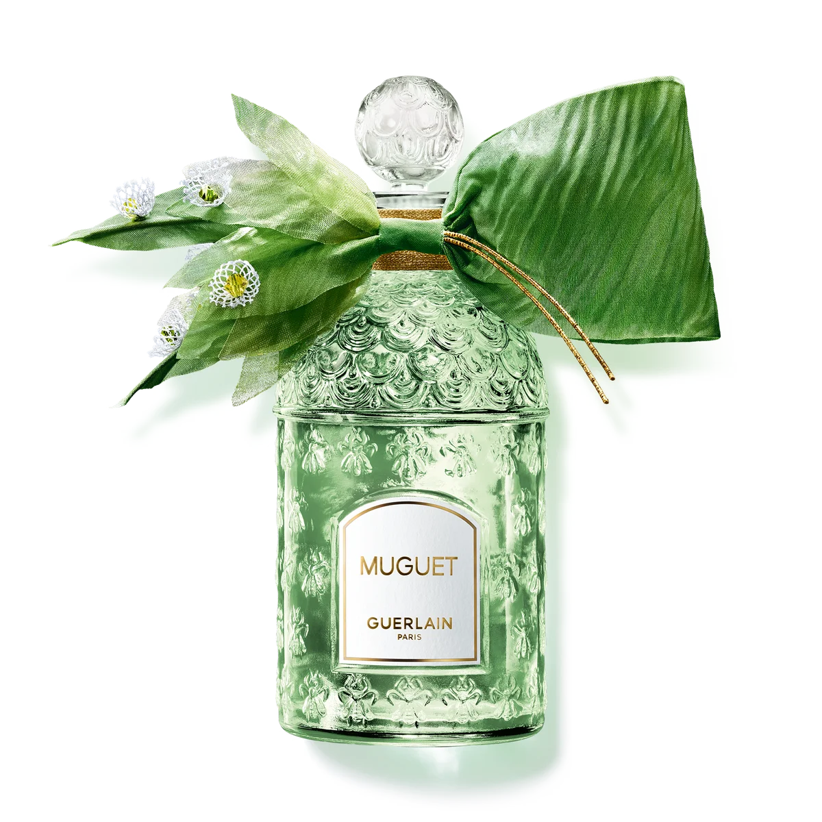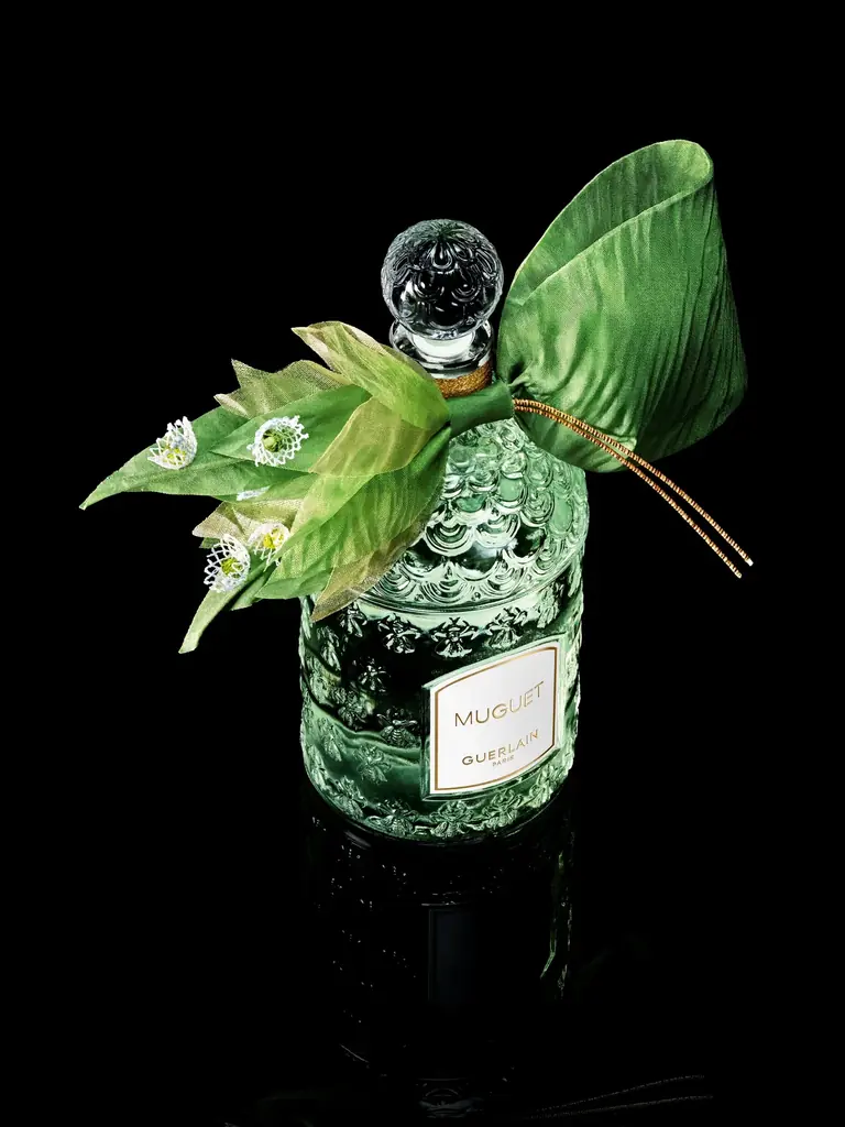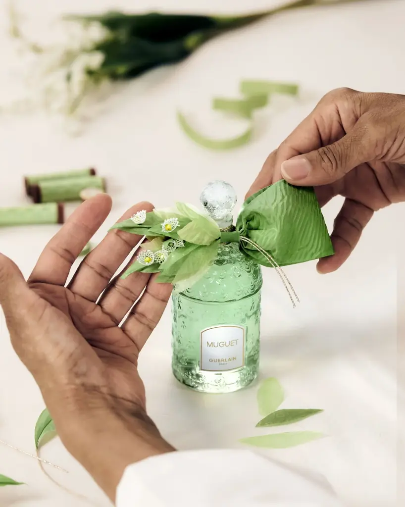 その後、細密な手刺繍が施される。レース状のスズランの花々はリボンから咲き出るように繊細に表現され、中心にはクリスタルの輝きが配置される。最後にこれらの装飾はゲランの工場(フランスのオルファンに位置)でボトルに取り付けられ、ネックにコードを手作業で結ぶ工程まで、複数の熟練職人による手作業が続く。