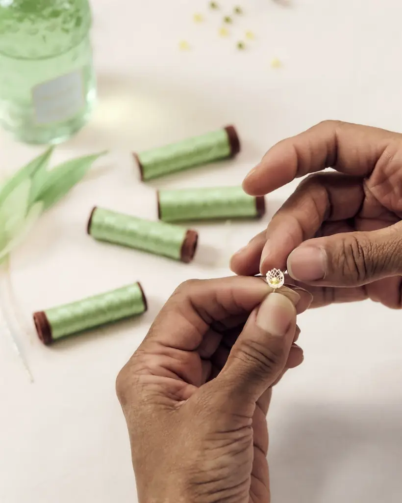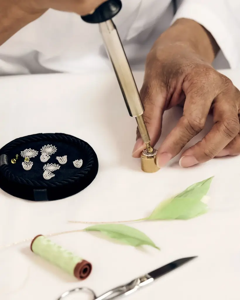 今回のコラボレーションでは、柔らかなグリーンのシルクタフタリボンを熱成形による「絞り」技法で仕立て、ボトルのネックに纏わせることで、新芽のような清々しさと光の反射を生み出している。リボンからは手刺繍によるスズランの鈴型の花々が咲き、それぞれの中心部には虹色に輝くパールやクリスタルが施されている。