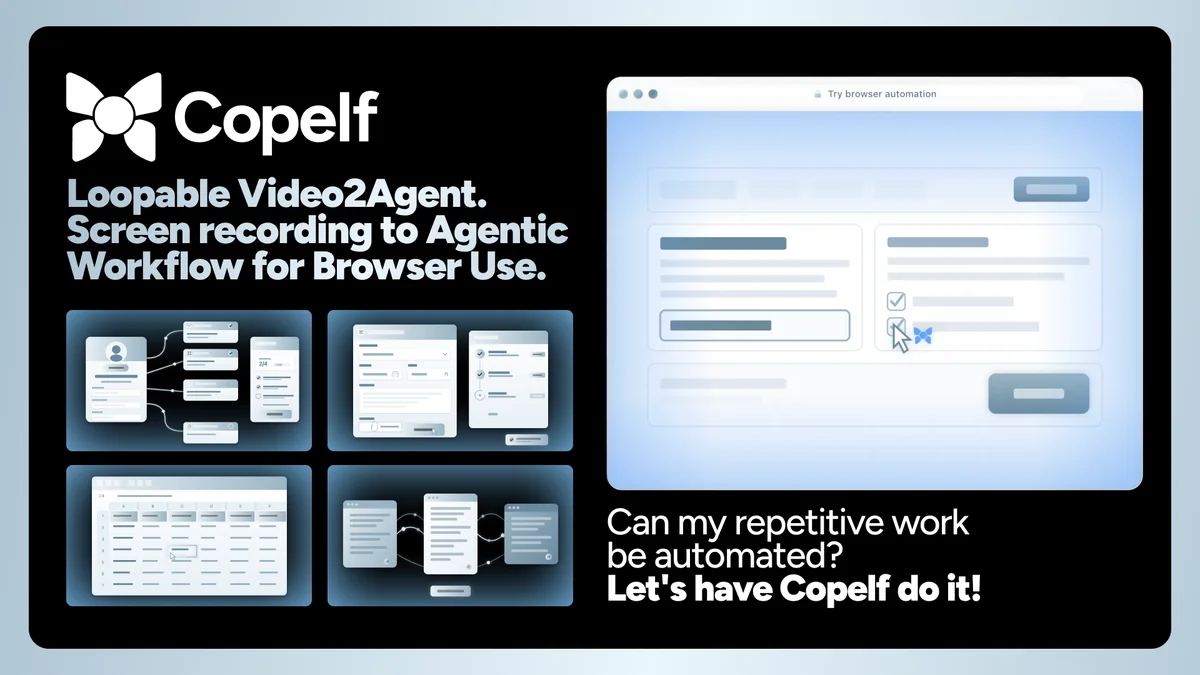 • Copelf:録画からAgenticワークフローを作成し、繰り返し自動処理を行うBrowser Use型AI(公式:https://copelf.com/ja)