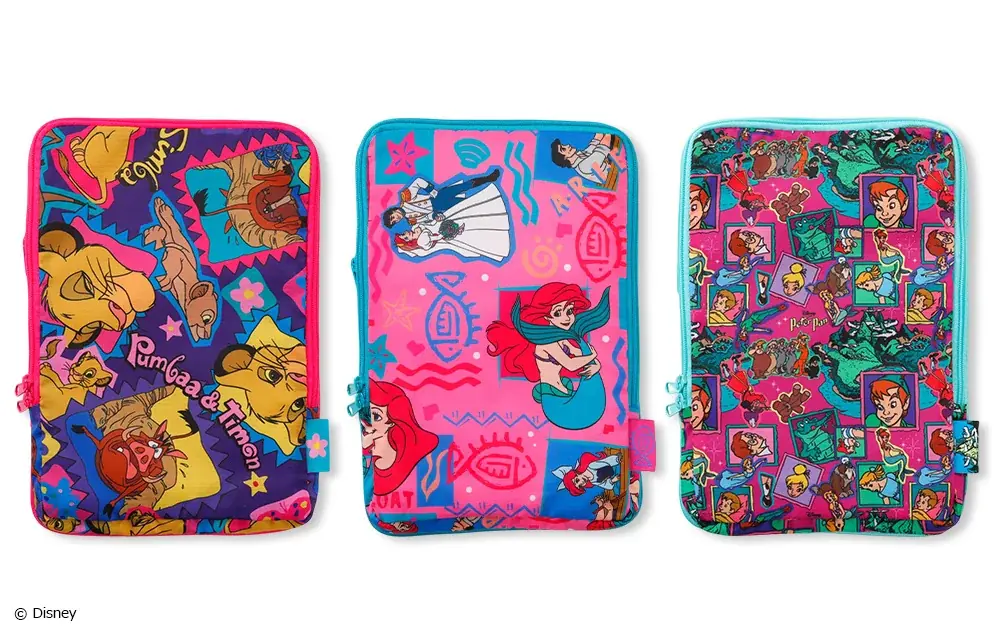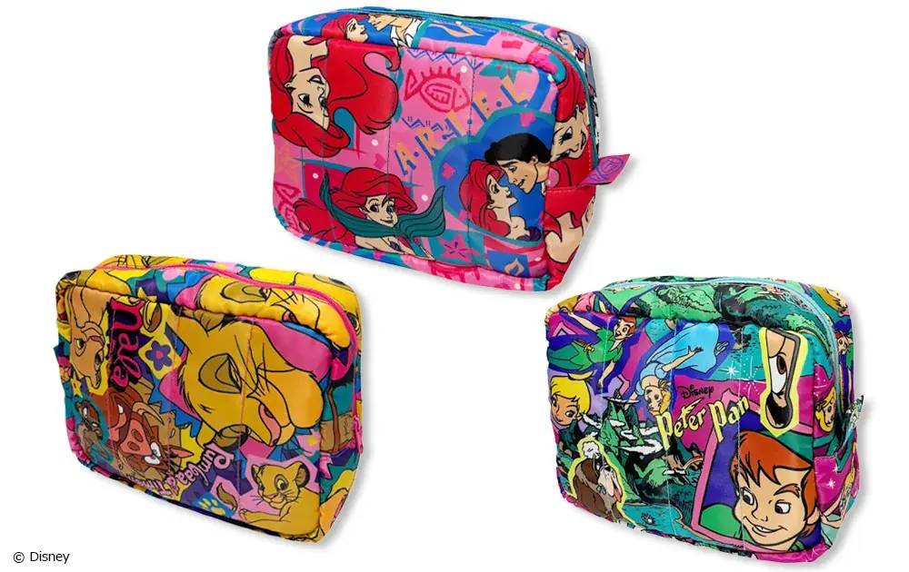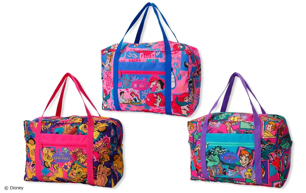 『ライオン・キング』『リトル・マーメイド』『ピーター・パン』の3作品を総柄で展開。キルティングポーチ2,750円ほかマルシェ2,640円、トラベル3,080円、ボストン5,500円。