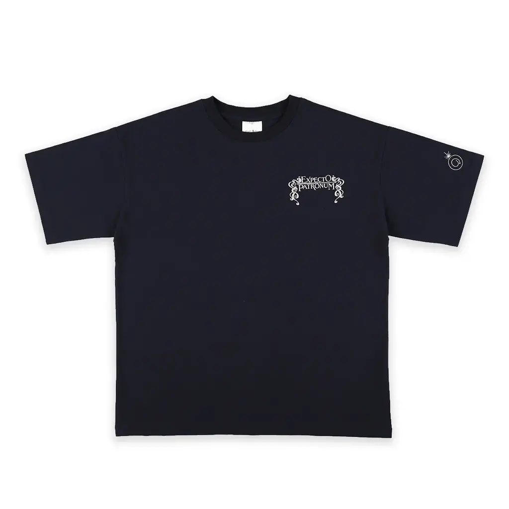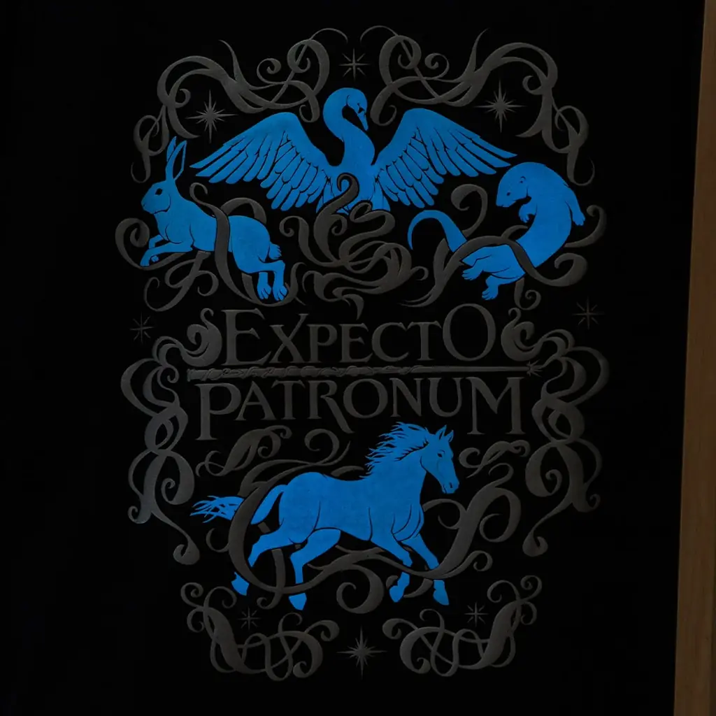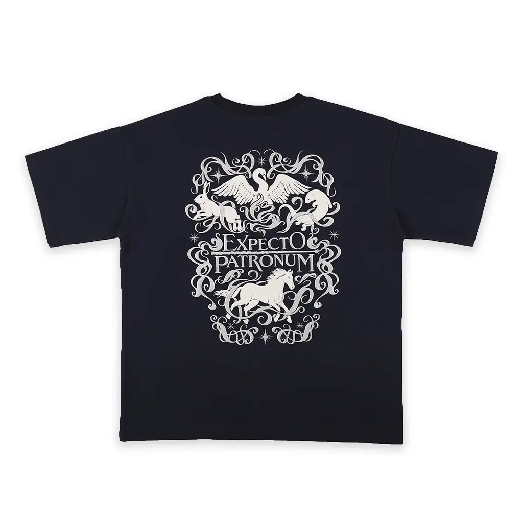 このTシャツは、作中の呪文「エクスペクト・パトローナム」で呼び出される守護霊(パトローナス)のアートをデザインしたものです。胸元と背面には立体的に見える発泡プリントが施され、パトローナスの図柄部分は蓄光仕様になっているため暗闇でぼんやりと青く光ります。