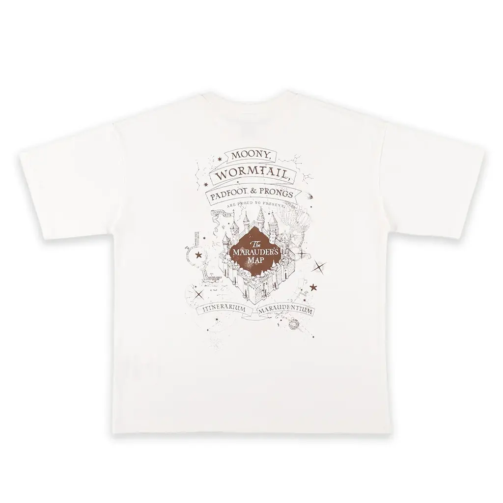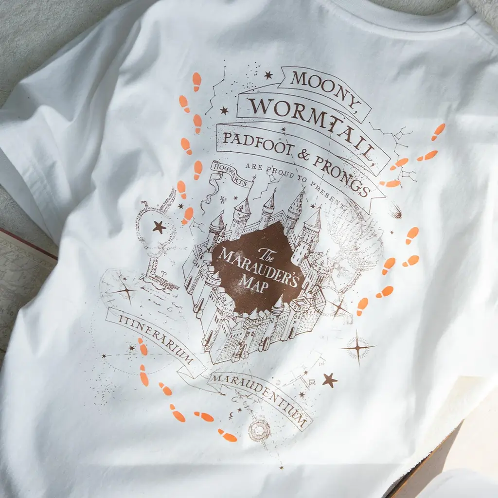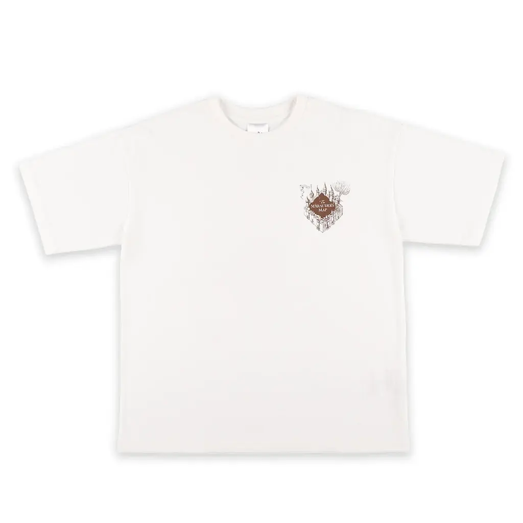 このTシャツは、ホグワーツの敷地内にいる者の位置がわかる魔法の地図「忍びの地図」をモチーフにしたデザインです。背面の一部にUV変色インクを使用しており、白地に同色でプリントされた部分が太陽光に当たるとオレンジ色へ変化します。