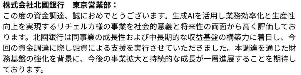 なお、借入先金融機関からのコメントについてはプレスリリース本文に具体的な発言は記載されていません。