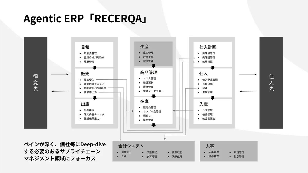 | 提供プロダクト | Agentic ERP「RECERQA」(AIエージェントによる受発注業務の判断・実行支援) |