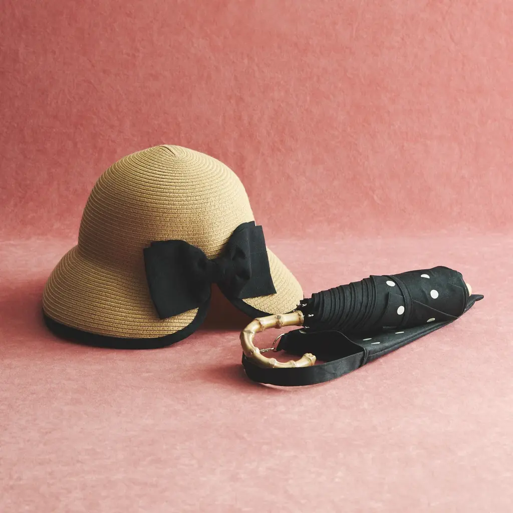 • バックリボンハット ¥4,290、晴雨兼用折りたたみ傘 ¥4,620