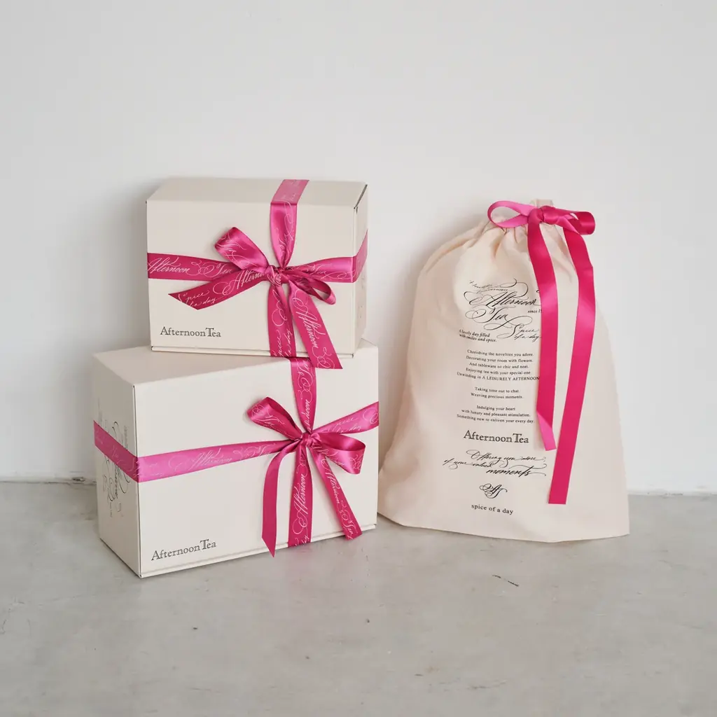4月8日(水)より、Afternoon Tea LIVINGの有料ギフトラッピングに限定ピンクが登場します。対象はギフトボックス(S・Mサイズ)およびコットン巾着(Mサイズ)のリボンカラーで、価格はギフトボックスSサイズ¥330、ギフトボックスMサイズ¥440、コットン巾着Mサイズ¥330(いずれも税込)です。