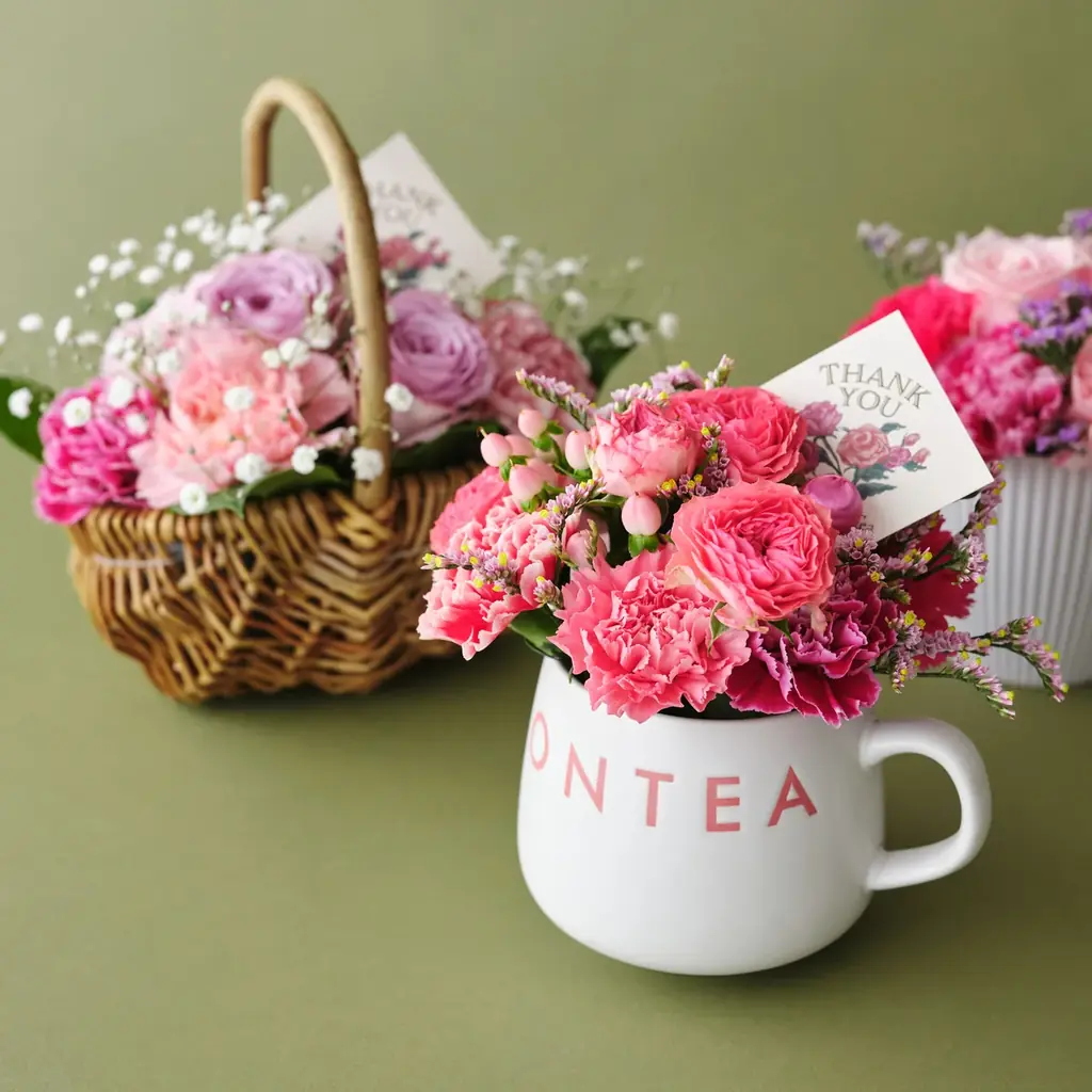 母の日の定番であるカーネーションを使用した生花アレンジは、Afternoon Teaの公式オンラインストアで4月16日(木)より受注開始となります。商品の一例として、Afternoon Teaのロゴをあしらったマグカップ風ポットに入ったアレンジや、華やかなブーケがバリエーション豊富に用意されます。