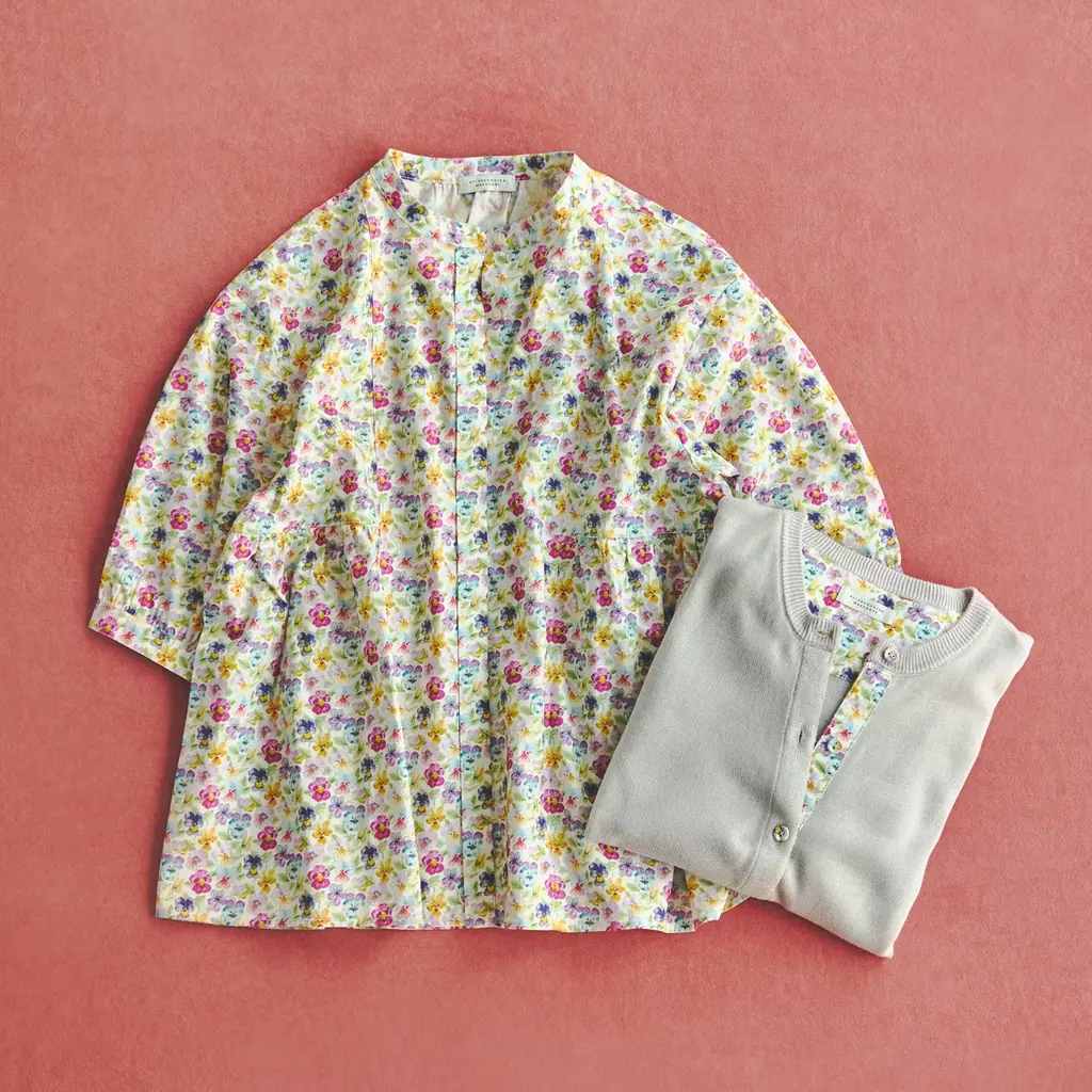 • リバティプリントブラウス ¥13,970、リバティプリントカーディガン ¥7,480