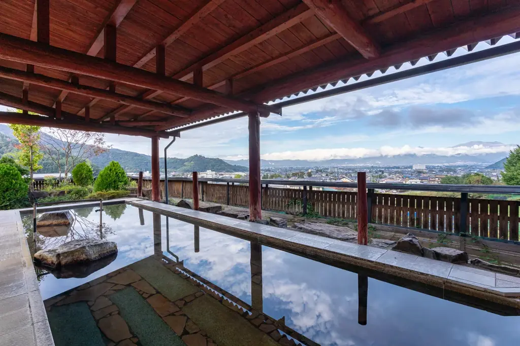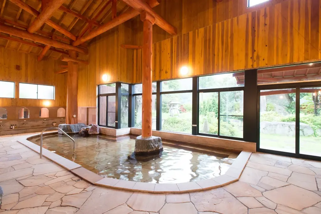温泉設備は、展望風呂・庭園露天風呂・内湯の計3種類を備え、四季折々の景観を楽しみながら入浴できる構成となっています。ゆったりと温泉に浸かり、カフェレストランで季節の料理を味わうという流れが想定されています。