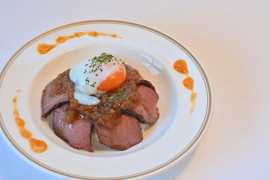 松代産あんずを用いた特製ソースが鹿肉の旨味を引き立て、温玉とライスとの組み合わせで満足感のある一皿に仕上げています。