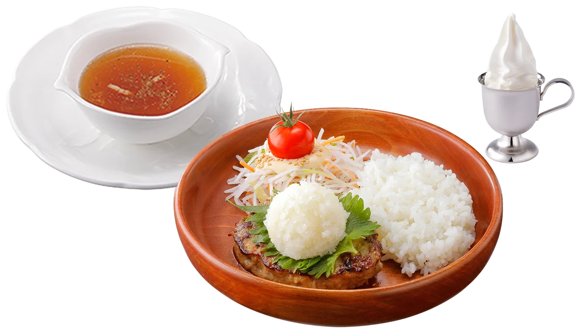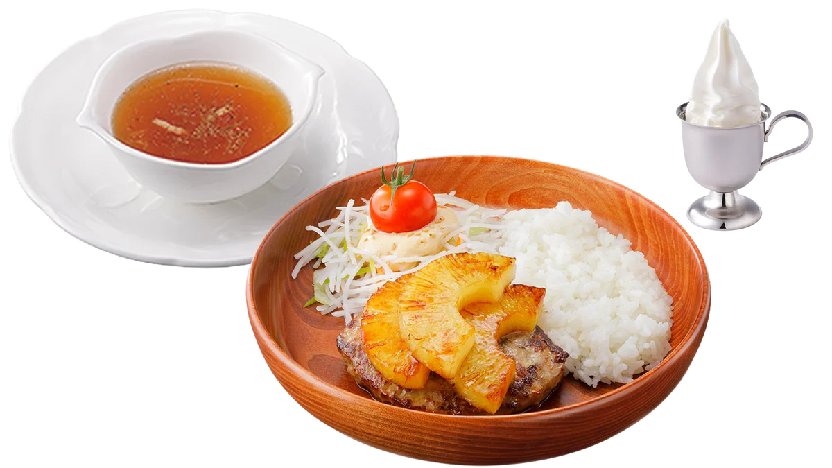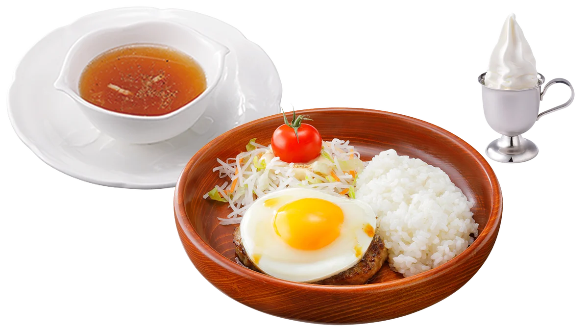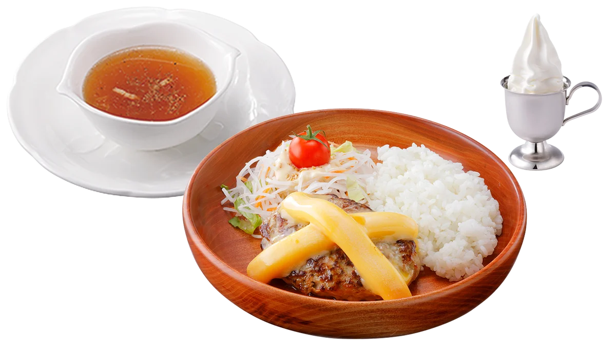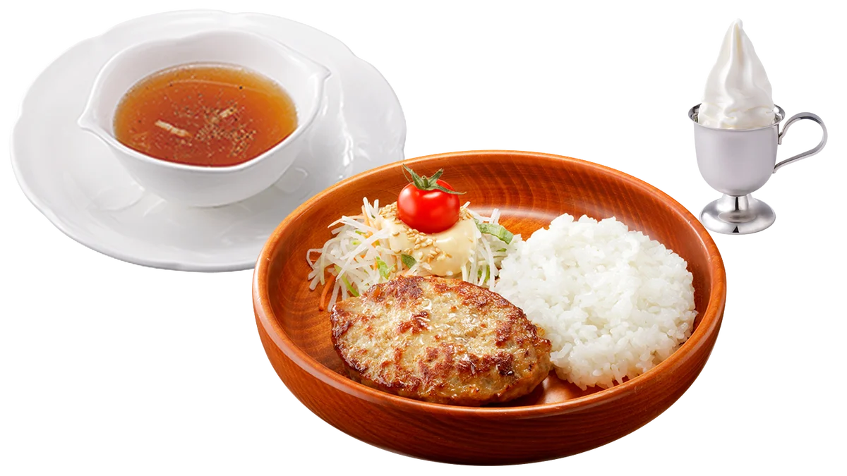 - 小さいハンバーグに少なめのライス、サラダを組み合わせた軽めのハンバーグディッシュです。スープ(ビーフコンソメスープまたはみそ汁)と北海道ミニソフトが付属します。北海道ミニソフトは希望によりドリンクへ変更可能です。