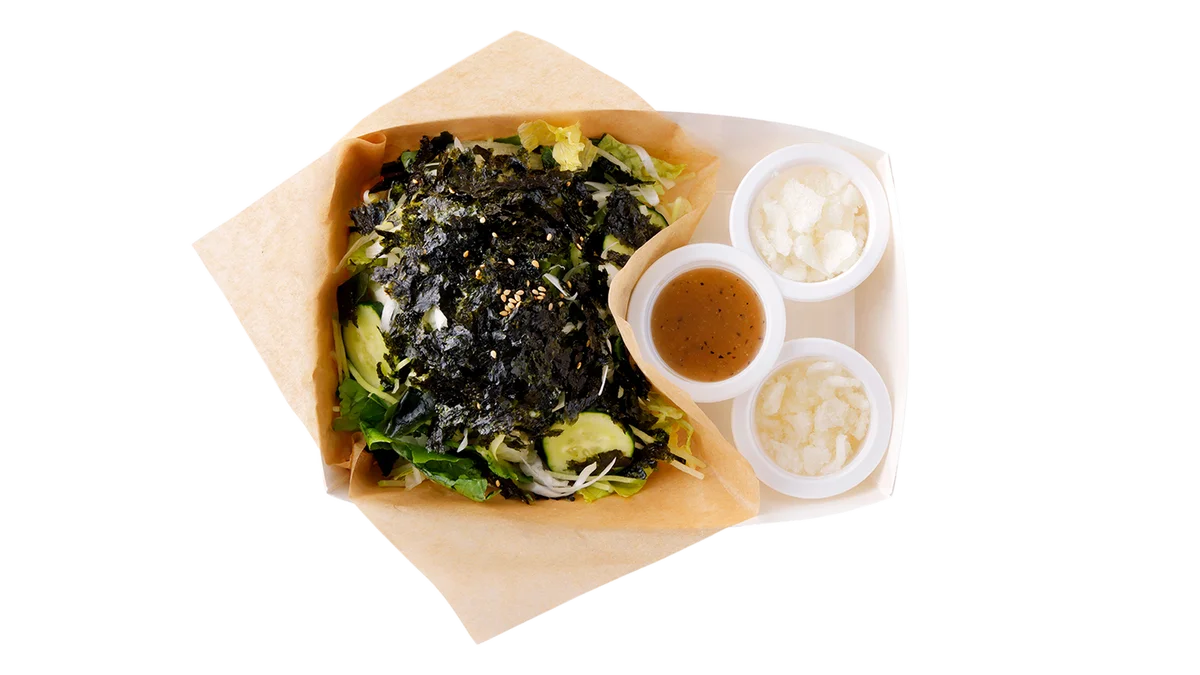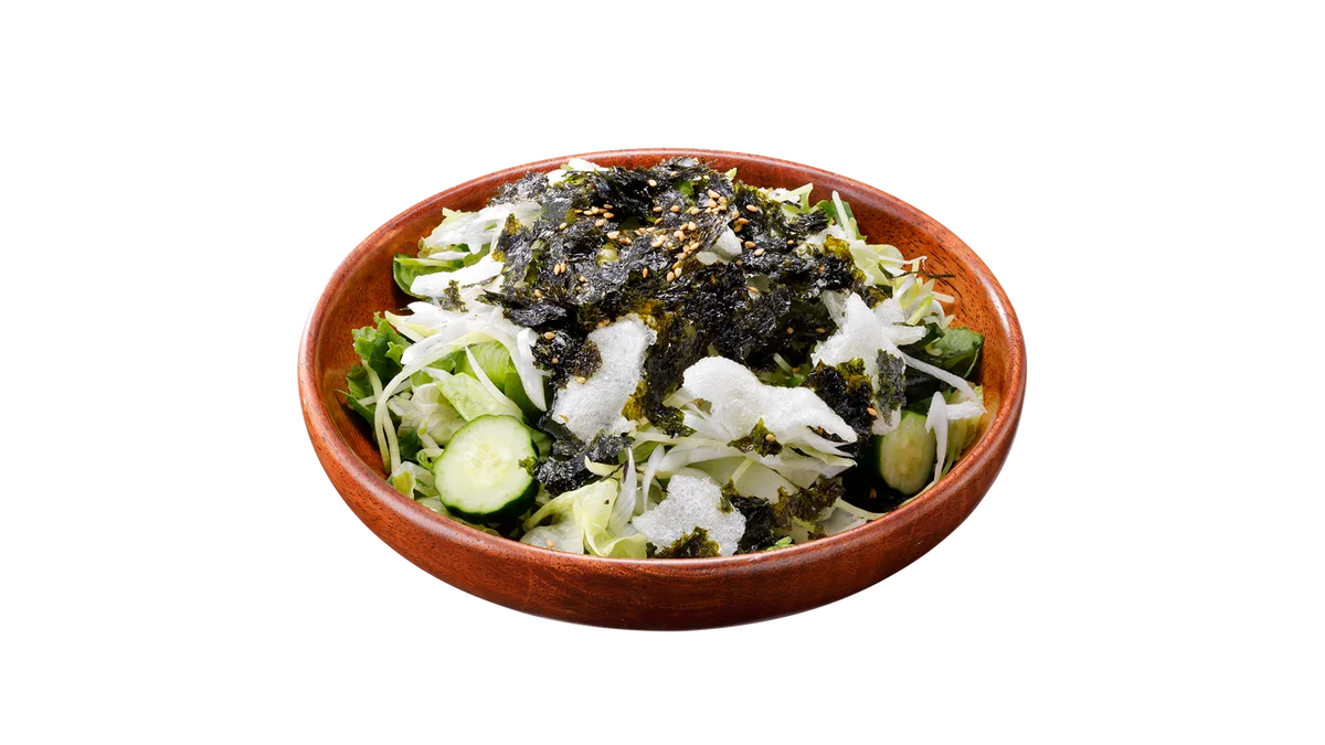 - きゅうり、ビタミン大根、わかめ、長ネギを合わせ、食感のアクセントとしてえびせんと韓国のりを添えます。香り豊かなネギ塩だれでやさしく絡めたサラダです。
