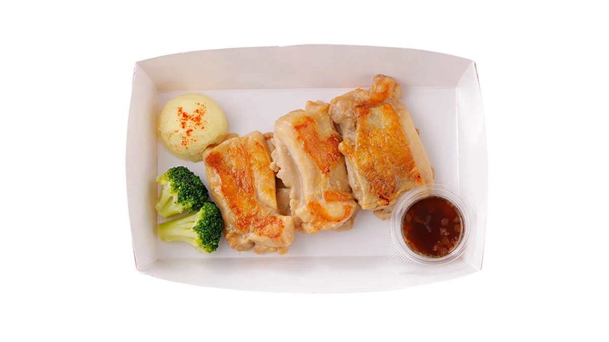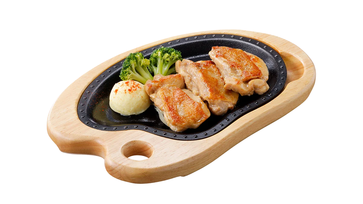 - 外側はこんがり、中はジューシーに仕上げたチキンステーキで、程よい刺激のガーリック風味が特徴です。ライスとの相性も想定されています。こちらも「チキンは食べやすい大きさに切り、よく噛んでお召し上がりください」との案内があります。