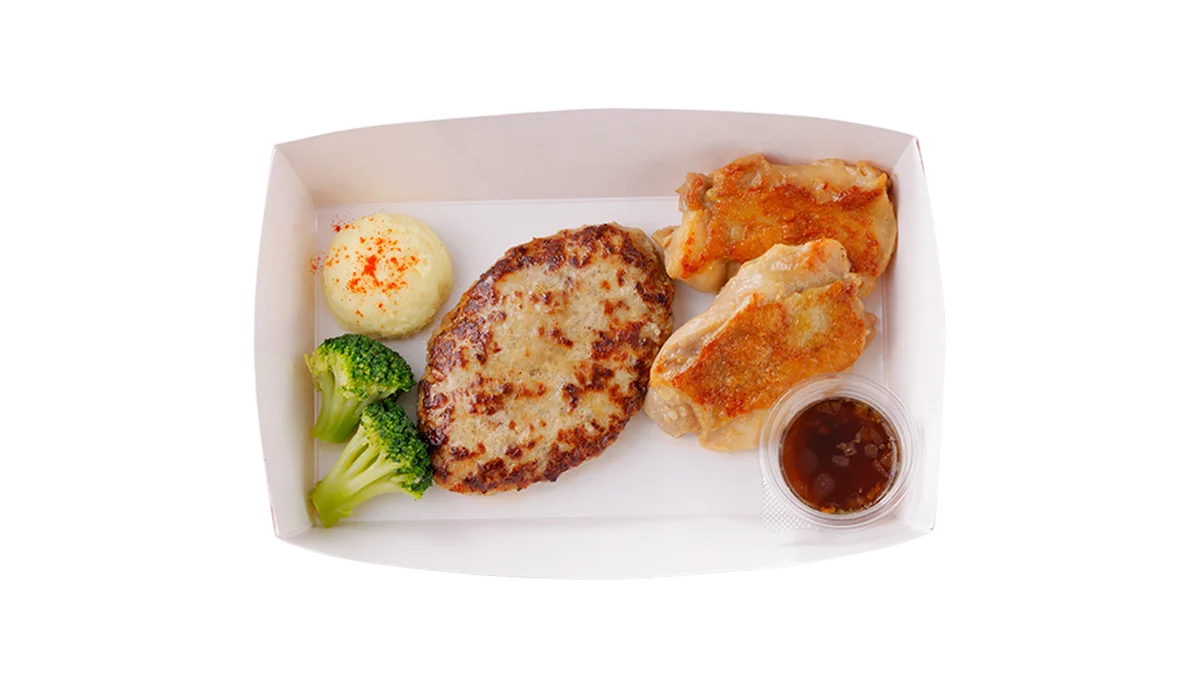 - 香ばしく焼き上げたガーリック風味のチキンステーキとハンバーグを盛り合わせた一皿です。提供にあたっては「お肉は食べやすい大きさに切り、よく噛んでお召し上がりください」との注意書きがあります。
