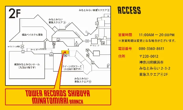 以下がタワーレコード みなとみらいブランチの所在地と営業時間です。駅直結の利便性があり、アクセス面での利点が大きい立地です。