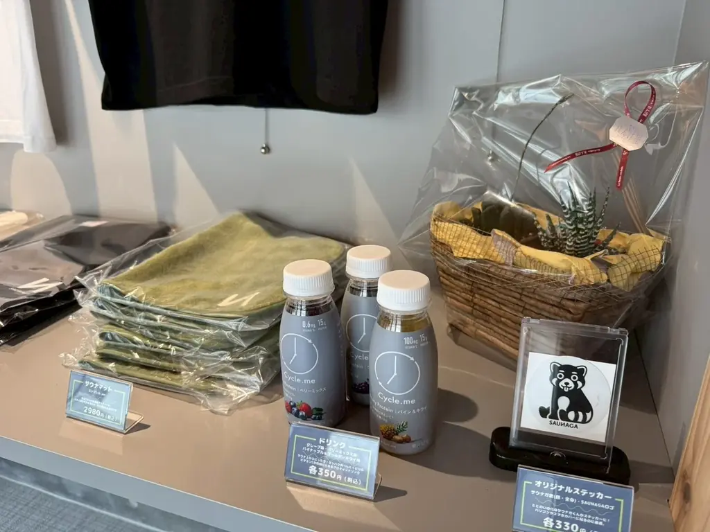 SAUNAGAは施設そのものの提供に加えて、アメニティやオリジナルグッズなどの物販も行います。公式マスコットキャラクター「サウナガくん」はレッサーパンダをモチーフにしたキャラクターで、店頭にてTシャツや各種サウナグッズを販売します。最も手頃な商品としてサウナガくんステッカー(330円)が紹介されています。
