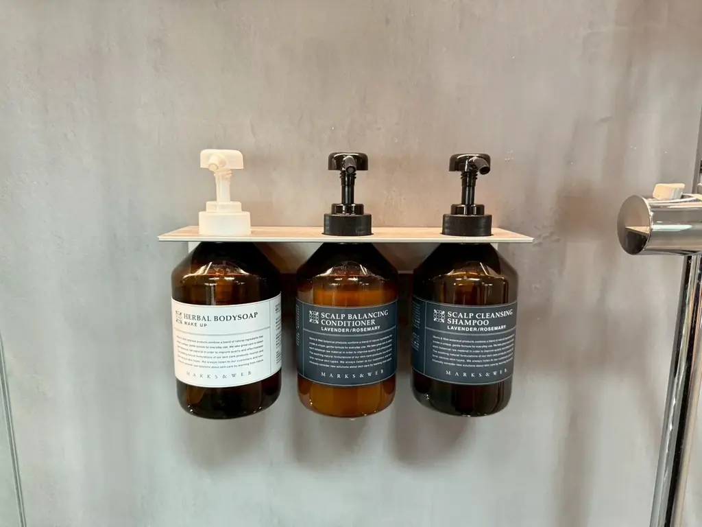 更衣室はグレーを基調としたモダンな設えで、パウダールームは広めに確保されています。ドライヤーはSALONIA製を4台常備し、手ぶらで来店しても利用できるよう各種アメニティを完備しています。バスセットはMARKS&WEB、無印良品の各種アメニティも導入されています。
