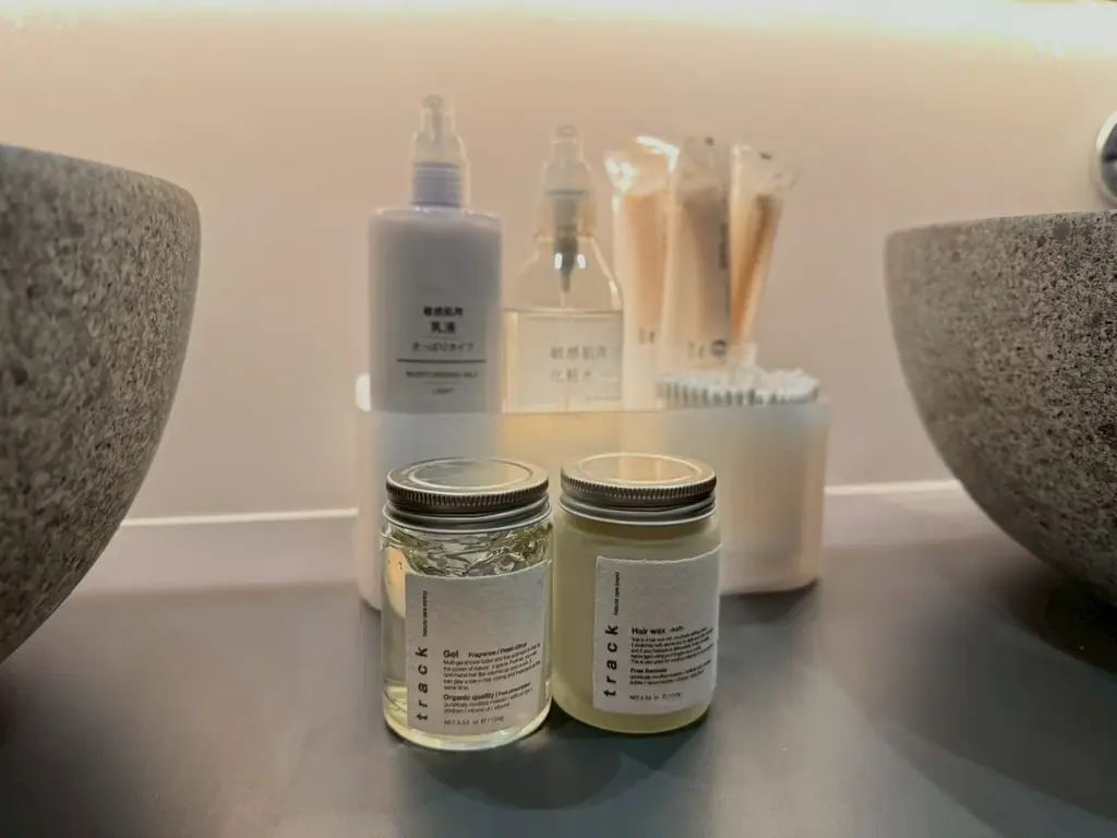 アメニティ周りでは無印良品やMARKS&WEBの製品、SALONIAドライヤー4台の常備といった構成により、利用後も出かけやすい仕様が整えられています。レンタル品としてポンチョや水着も用意されているため、手ぶらでの来店を想定した準備がなされています。