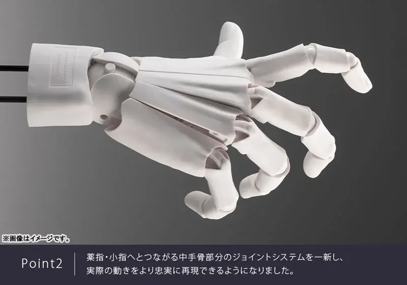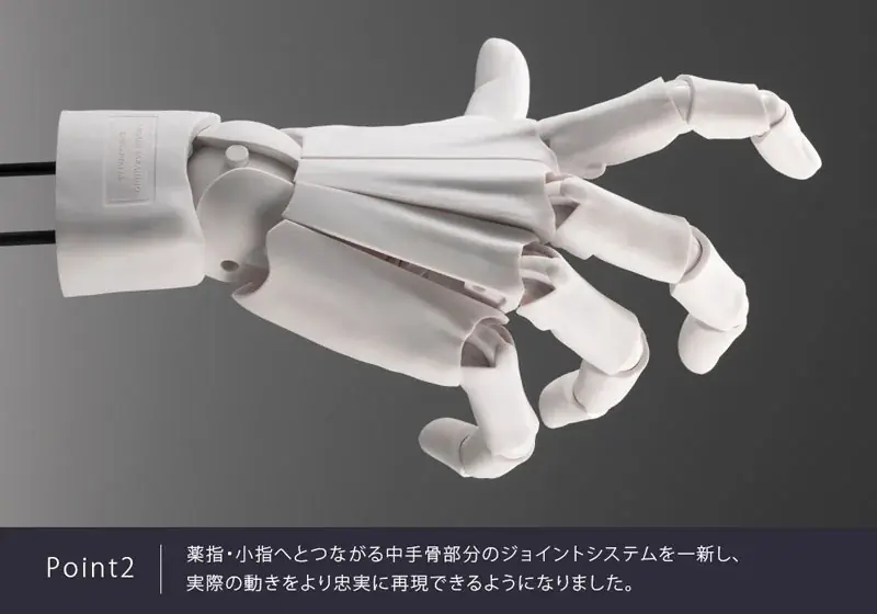 従来モデルは主に手の甲のフォルムを重視した可動構造でしたが、MENSモデルでは薬指・小指につながる中手骨部分のジョイントを刷新し、実際の手の動きにより忠実な追従性を確保しています。これにより指同士の連動や、指根元からの曲がり方が自然になります。